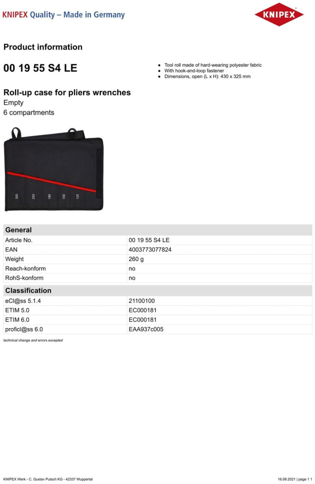 Τεχνικά στοιχεία: Αριθμός προϊόντος: 00 19 55 S4 LEEAN: 4003773077824 Βάρος: 260 γραμμάρια Εύρος Συμμόρφωση: όχι RohS-conform: όχι Ανοιχτές διαστάσεις (Μ x Υ): 430 x 325 mm Ρολό εργαλείου κατασκευασμένο από ανθεκτικό πολυεστερικό ύφασμα με Velcro * Ενδεικτικές φωτογραφίες.