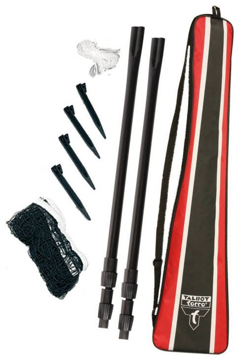 Ένα δίχτυ μπάντμιντον πλήρους μεγέθους με τηλεσκοπικούς στύλους και μανταλάκια πρόσδεσης.