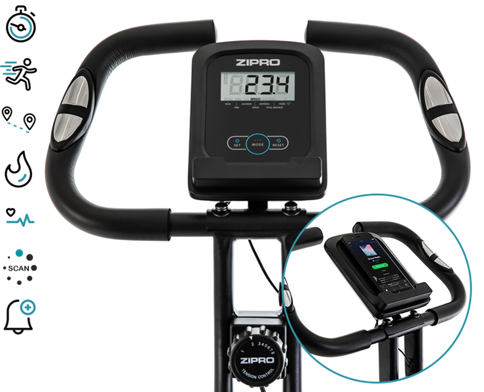 Το ποδήλατο διαθέτει υπολογιστή με οθόνη LCD και βάση για κινητό ή tablet, ώστε να έχεις πάντα δίπλα σου το smartphone και να χρησιμοποιείς εφαρμογές προπόνησης. Τα 3 κουμπιά λειτουργίας παρέχουν εύκολη χρήση, ενώ οι προφορτωμένες λειτουργίες σου επιτρέπουν να παρακολουθείς τα εξής: