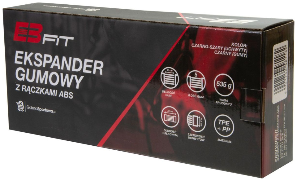 Παράμετροι:• Διαστάσεις - λαβή: πλάτος 14,5 cm / μήκος 11 cm - συνολικό μήκος του διαστολέα: 73 cm - λάστιχα: μήκος 46 cm / διάμετρος 9 mm • Αριθμός λαστιχιών: 5 • Χρώμα: μαύρο και γκρι • Καθαρό βάρος : 540 g • Βάρος μεικτό: 660 g• Συσκευασία: 35,5 x 15,5 x 7 cm (αισθητικό colorbox)• Υλικά: TPE (λάστιχα), PP + ABS (λαβές)• Μάρκα: EB Fit