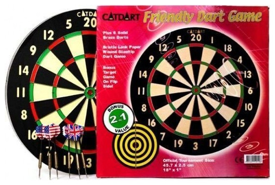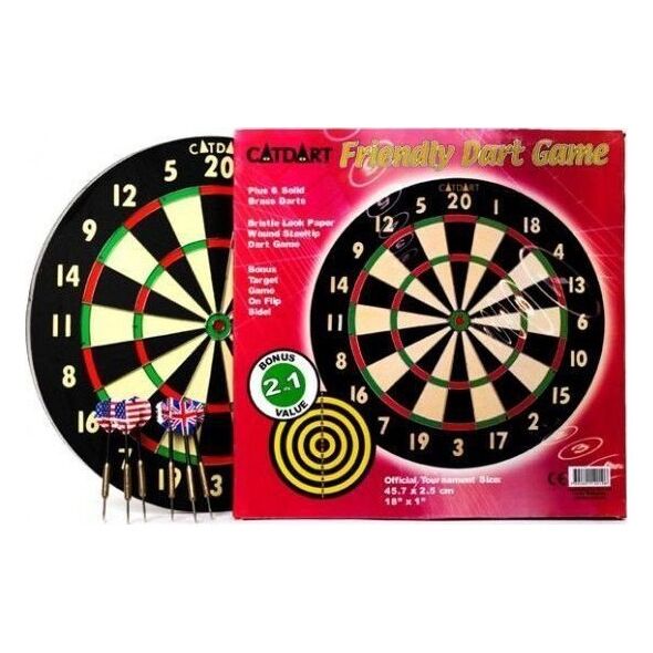 Σετ βελάκια Catdart (διπλής όψης βελάκια, 2 σετ βελάκια, ψυχαγωγικό παιχνίδι) Πίνακας βελών ψυχαγωγίας με μεταλλικά βελάκια STEELTIP. Το καντράν είναι κατασκευασμένο από φυσικό χάρτινο υλικό που μοιάζει με επαγγελματικό. Το σετ περιλαμβάνει: Ένα βελάκι από φυσικό χάρτινο υλικό (το βελάκι έχει 2 πλευρές: τουρνουά και παιχνίδι στόχου στο πίσω μέρος) με πρακτική μεταλλική βάση τοίχου, 2 μεταλλικά σετ βελάκια των 20g (6 κομμάτια συνολικά, δηλαδή 2 x 3) , αντικαταστάσιμοι έγχρωμοι άξονες και έγχρωμα βελάκια Εγχειρίδιο σε 8 γλώσσες Χαρακτηριστικά: Δίσκος: 45,7 x 2,5 cm [18 x 1 ίντσα] - επίσημο μέγεθος σανίδας βελών για βελάκια, Βάρος: 4 κιλά Βελάκια: Βάρος 20 γραμμάρια το καθένα Οθόνη σε πολύχρωμο κουτί από χαρτόνι Η καρδιά της Bex Sport είναι το πάθος μας να προσφέρουμε προϊόντα που δίνουν χαρά. Χαρά και για μικρούς και μεγάλους, ανάμεσα σε οικογένεια και φίλους. Μας αρέσει να εφευρίσκουμε και να παράγουμε παιχνίδια που μπορείτε να τα απολαύσετε τόσο σε εσωτερικούς όσο και σε εξωτερικούς χώρους. Απλοί κανόνες που σας επιτρέπουν να αρχίσετε να παίζετε γρήγορα και, εάν είναι απαραίτητο, να προσαρμόσετε τους κανόνες έτσι ώστε όλοι να μπορούν να τους απολαύσουν. Η ομάδα αγορών της Bex Sport προσπαθεί συνεχώς να παρέχει την καλύτερη ποιότητα και σχεδιασμό σε ελκυστικές συσκευασίες. Εμπορικός δείκτης: GXP-836936 Barcode: 7392601120106 Ηλικία ή έτος: από 8 ετών