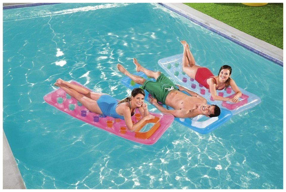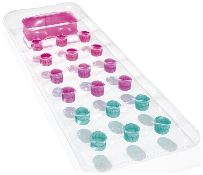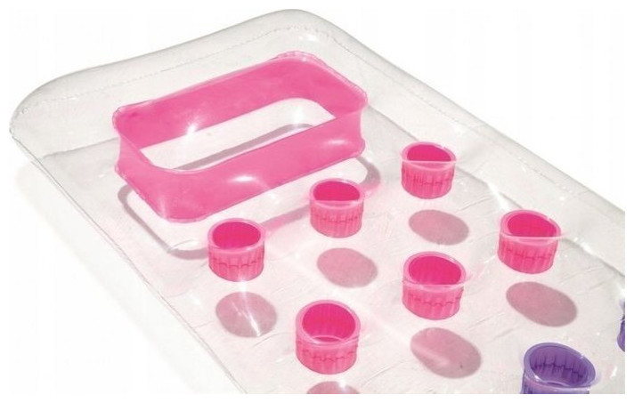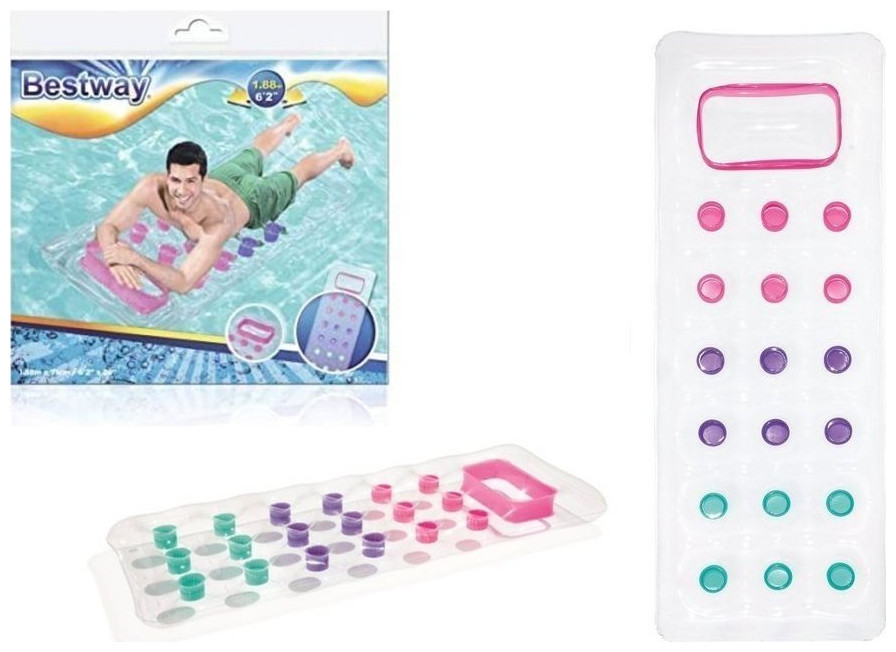 Dmuchany Materac Przezroczysty 188 x 71 cm Bestway 43040Materac to najbardziej popularny dodatek do wyjazdów nad wodę. Zaopatrz się więc w materac, który idealnie spełni Twoje oczekiwania i pomoże Ci się zrelaksować w wolnym czasie. Materac jest bardzo wygodny a dzięki swojej stelażowej budowie zapewni Ci odpowiednie dopasowanie do ciała. Zawarte w nim otwory mogą posłużyć Ci nawet jako uchwyt na napoje. Stworzony jest z wytrzymałego materiału PVC odpornego na uszkodzenia dzięki czemu nie będziesz musiał się martwić, że coś zepsuje Ci Twój odpoczynek.Dane techniczne:- wymiary 188 cm x 71 cm - materiał PVC- maksymalne obciążenie do 90 kg- ciekawa kolorystyka - grubość materiału PVC 0,24 mm - Poduszka z oknem- łatka naprawcza w zestawie Waga:1kgWymiary opakowania:30 x 27 x 5 cmInformacje o produkcie