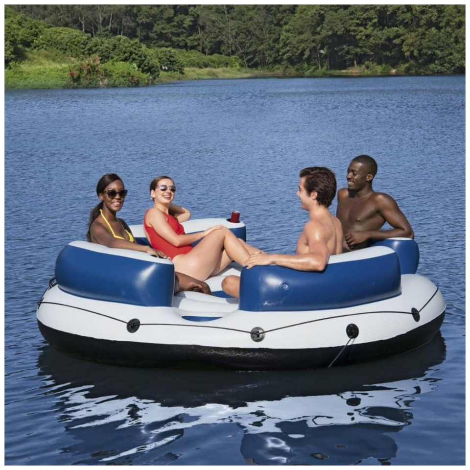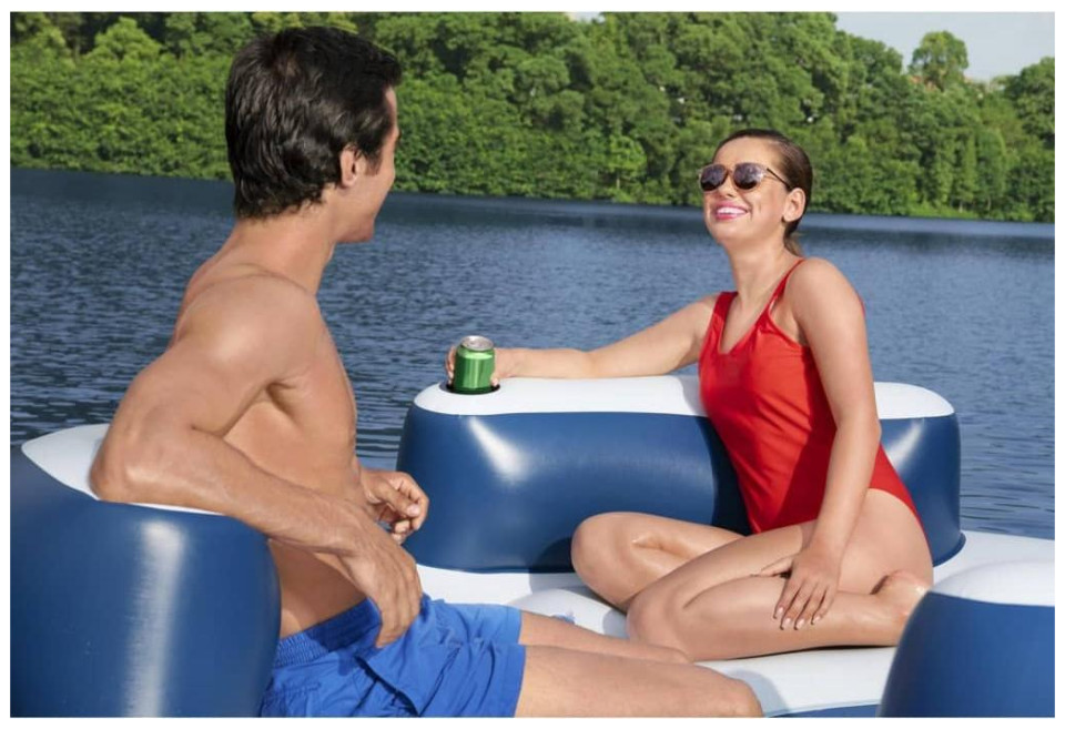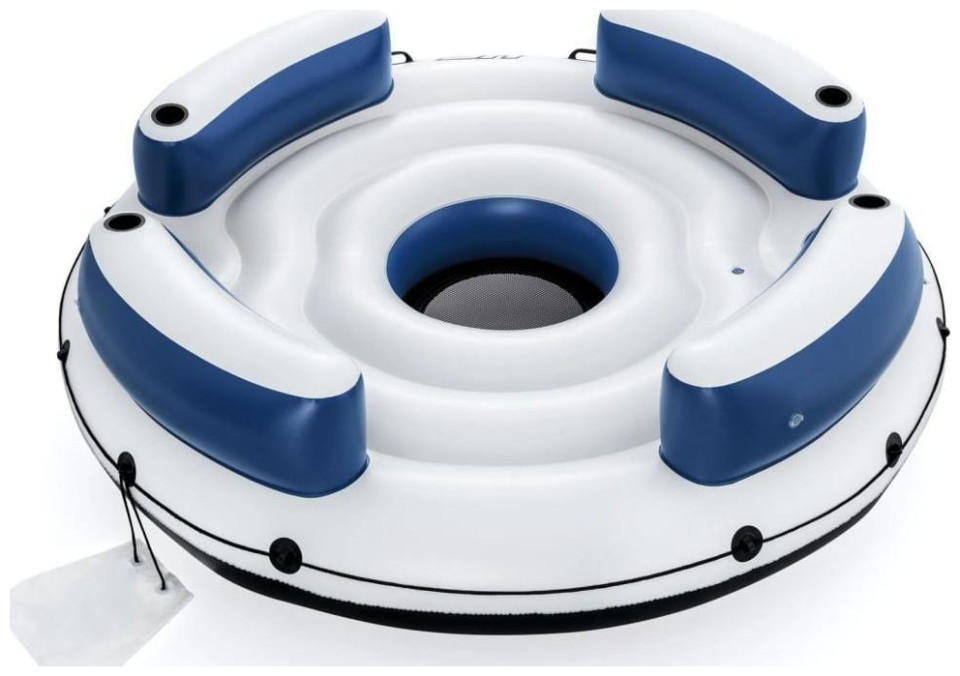 Το στρώμα είναι κατασκευασμένο από PVC, καθιστώντας το ελαφρύ, αλλά ισχυρό και ανθεκτικό. Το υλικό που χρησιμοποιείται είναι ανθεκτικό σε τρυπήματα και τεντώματα και αυξάνει την πρόσφυση. Αυτό το προϊόν προορίζεται για τέσσερα άτομα με μέγιστο συνολικό βάρος 360 κιλά. Η πλάτη, τα μπράτσα και το προσκέφαλο παρέχουν μεγαλύτερη άνεση. Διχτυωτός πάτος και σχοινί ολόγυρα με ενσωματωμένες οπές για πρόσθετη ασφάλεια. Το πλωτό νησί διαθέτει δύο στιβαρές λαβές για να σας κρατούν σταθερούς και ισορροπημένους στο νερό.