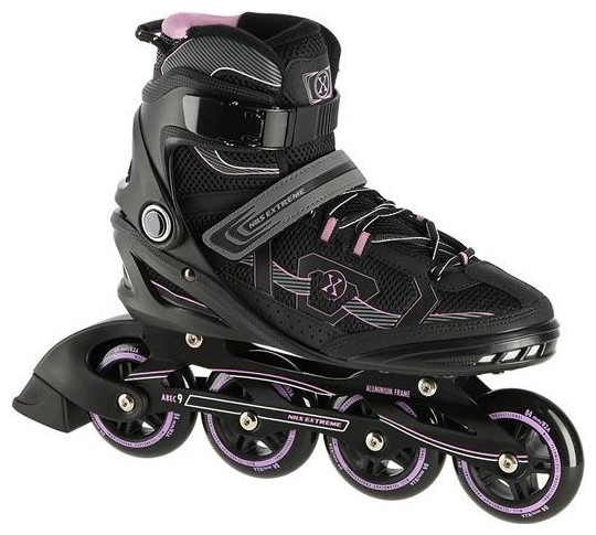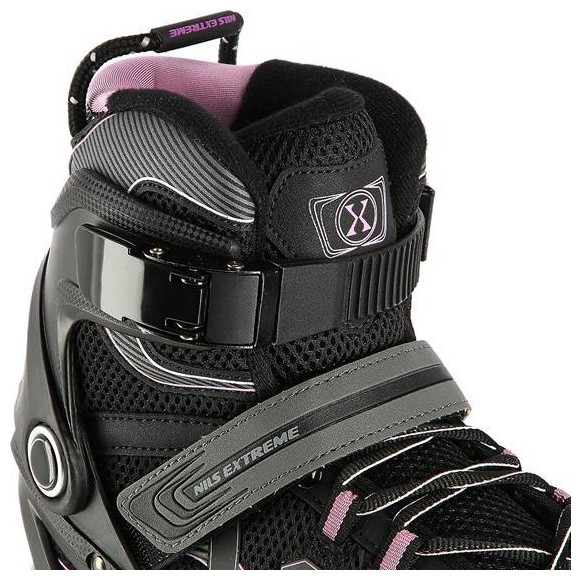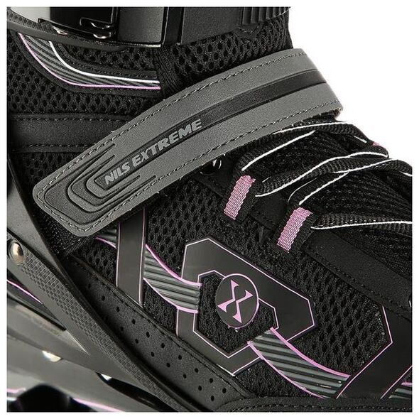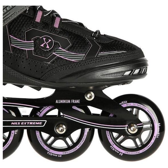 NA9157 Nils Extreme to łyżworolki przeznaczone dla osób średnio zaawansowanych i zaawansowanych do jazdy rekreacyjnej. Ich atrakcyjny wygląd to efekt nie tylko ciekawego wzornictwa, ale przede wszystkim użycia bardzo wysokiej jakości materiałów, które gwarantują bardzo duży komfort użytkowania.Wysoka jakość wykonaniaBut wykonany został z materiału EVA i VELVET, siatki MESH oraz pianki o dużej gęstości. Dzięki temu jazda będzie niezwykle komfortowa. Dodatkowo posiada oddychającą membranę oraz jest wentylowany.Solidna konstrukcjaŁyżworolka jest bardzo lekka dzięki aluminiowej płoza oraz podstawy buta, która wykonana z wysokiej jakości PP. Dodatkowo miękkie kółka gwarantują dobrą przyczepność do podłoża oraz dobrze absorbują wszystkie drgania, natomiast łożyska klasy ABEC9 zapewniają wysoką jakość trakcji.BezpieczeństwoZapięcie buta za pomocą klamry dwusekcyjnej, rzepa i sznurowadeł, zapewnia maksymalne bezpieczeństwo podczas jazdy, natomiast hamulec wykonany z najwyżej jakości PP odpornego na uderzenia spowoduje bezpieczne zatrzymanie, nawet przy stosunkowo dużych prędkościach.Specyfikacja:Płoza łyżworolki: aluminiowaŁożyska: ABEC 9 CHROMEBut: półmiękkiKółka: PU 84 mm/82AMateriał:pianka o dużej gęstości 10mmsiatka MESHVELVETmateriał EVADługość wkładki: 280 mmZapięcie:klamra dwusekcyjnapasek na rzepsznurowanieŁyżworolka wyposażona w hamulec