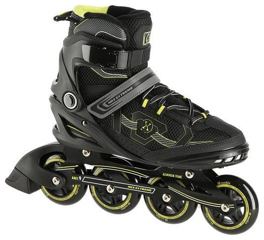 NA9157 Nils Extreme to łyżworolki przeznaczone dla osób średnio zaawansowanych i zaawansowanych do jazdy rekreacyjnej. Ich atrakcyjny wygląd to efekt nie tylko ciekawego wzornictwa, ale przede wszystkim użycia bardzo wysokiej jakości materiałów, które gwarantują bardzo duży komfort użytkowania.Wysoka jakość wykonaniaBut wykonany został z materiału EVA i VELVET, siatki MESH oraz pianki o dużej gęstości. Dzięki temu jazda będzie niezwykle komfortowa. Dodatkowo posiada oddychającą membranę oraz jest wentylowany.Solidna konstrukcjaŁyżworolka jest bardzo lekka dzięki aluminiowej płoza oraz podstawy buta, która wykonana z wysokiej jakości PP. Dodatkowo miękkie kółka gwarantują dobrą przyczepność do podłoża oraz dobrze absorbują wszystkie drgania, natomiast łożyska klasy ABEC9 zapewniają wysoką jakość trakcji.BezpieczeństwoZapięcie buta za pomocą klamry dwusekcyjnej, rzepa i sznurowadeł, zapewnia maksymalne bezpieczeństwo podczas jazdy, natomiast hamulec wykonany z najwyżej jakości PP odpornego na uderzenia spowoduje bezpieczne zatrzymanie, nawet przy stosunkowo dużych prędkościach.Specyfikacja:Płoza łyżworolki: aluminiowaŁożyska: ABEC 9 CHROMEBut: półmiękkiKółka: PU 84 mm/82AMateriał:pianka o dużej gęstości 10mmsiatka MESHVELVETmateriał EVADługość wkładki: 250 mmZapięcie:klamra dwusekcyjnapasek na rzepsznurowanieŁyżworolka wyposażona w hamulec