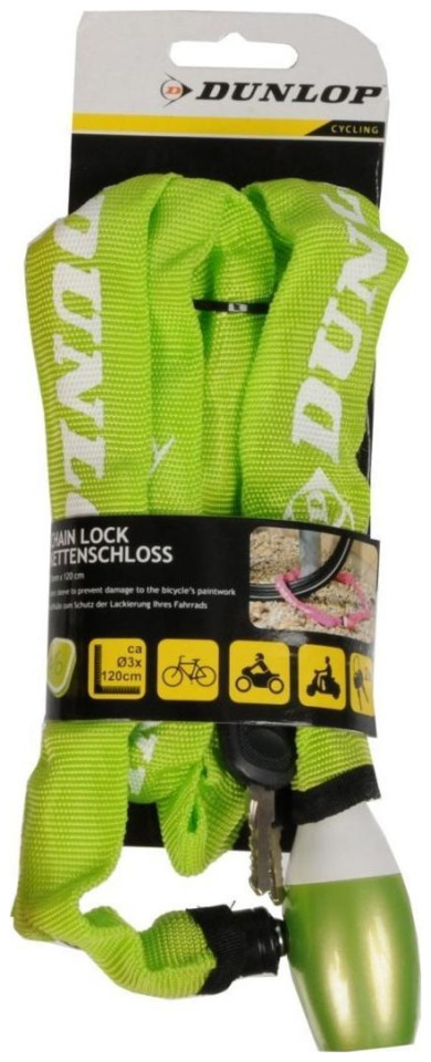 ΑΛΥΣΙΔΑ ΚΛΕΙΔΑΡΙΑΣ ΠΟΔΗΛΑΤΟΥ ΜΕ ΜΗΚΟΣ ΚΛΕΙΔΑΡΙΑΣ Το DUNLOP 120cm είναι κατασκευασμένο από συμπαγές και ανθεκτικό χάλυβα, το οποίο καλύπτεται επιπλέον με ανθεκτικό στην τριβή υλικό για προστασία του πλαισίου από γρατσουνιές και ζημιές. Το μήκος της αλυσίδας είναι έως και 120 cm, ώστε να μπορείτε να την προσαρμόσετε εύκολα σε μόνιμα στοιχεία υποδομής, για παράδειγμα μια κουπαστή ή μια σχάρα ποδηλάτου. Η κυψέλη έχει πάχος 3 mm, πλάτος 15 mm και μήκος 33 mm, καθιστώντας την εξαιρετική προστασία κατά της κλοπής. Το κλείσιμο και το άνοιγμα της κλειδαριάς είναι πολύ απλό και γίνεται με το γύρισμα του κλειδιού στην κλειδαριά.