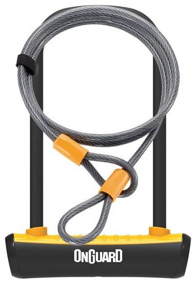 Κλειδαριά ποδηλάτου της ONGUARD, κατασκευασμένη από υλικά υψηλής ποιότητας. Το προϊόν έχει δύο κλειδιά, ένα σχοινί και μια λαβή.