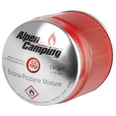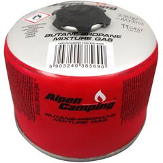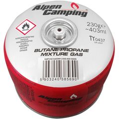 Φιάλη αερίου 230g Alpen Camping. πιστοποιητικό: Pi 0656, σύμφωνο με EN417, προπάνιο-βουτάνιο, εύρος -10°c έως + 40°c, βαλβίδα με σπείρωμα 7/
