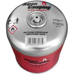 Φιάλη αερίου 450g Alpen Camping. πιστοποίηση: Pi 0437, σύμφωνο με EN417, προπάνιο-βουτάνιο, εύρος -10°c έως + 40°c, βαλβίδα με σπείρωμα 7/