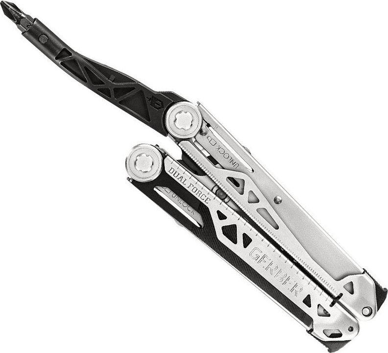 Το πολυεργαλείο Gerber Dual-Force είναι το μόνο πολυεργαλείο στην αγορά που προσφέρει κλειδαριά λαβίδας δύο θέσεων και μεγάλα δόντια για ασφαλές κράτημα και έλεγχο. Ένα κατσαβίδι με αντικαταστάσιμες μύτες τοποθετημένες στον άξονα του εργαλείου εγγυάται μέγιστη ροπή. Η λαβή πολλαπλών εργαλείων είναι 47% στενότερη από τα ανταγωνιστικά εργαλεία, γεγονός που καθιστά το κράτημα πιο ασφαλές. Οι πιο σημαντικές λειτουργίες και στοιχεία του εργαλείου: Πένσα Tempe Μικρός σφιγκτήρας στην πένσα Μεγάλος σφιγκτήρας στην πένσα Δύο θέσεις πένσας (για μεγάλα και μικρά στοιχεία) Κόπτης σύρματος και απογυμνωτής σύρματος Κατσαβίδι με αντικαταστάσιμες μύτες τοποθετημένες στον άξονα του εργαλείου λάμα μήκους 8,25 cm Μεζούρα (ίντσες) και cm) 3 bit στο σετ (επίπεδο και σταυρό #1, #2) Αποθήκευση μιτών (2) Αρχείο Saw Chisel Λεπτή και χοντρή Τρύπα για λουρί/κορδόνι Νάιλον κάλυμμα 25 χρόνια εγγύηση Μήκος όταν είναι κλειστό: 11,8 cm Βάρος: 340,19 g 12 εργαλεία Σχέδιο πεταλούδας Κλειδαριά εργαλείου Περιλαμβάνεται κάλυμμα