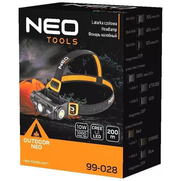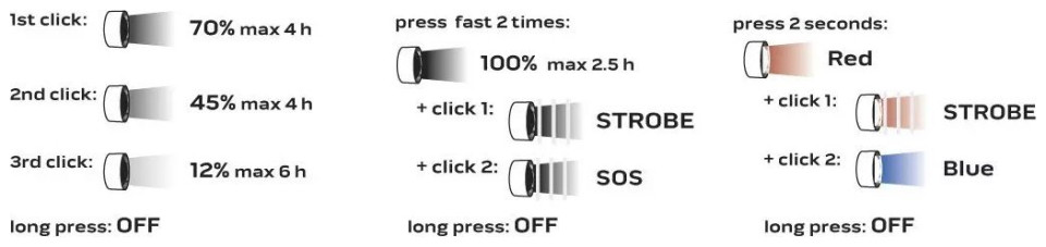6 λειτουργίες φωτισμού: 100%, 70%, 45%, 12% strobe, SOS, κόκκινο φως, μπλε φως