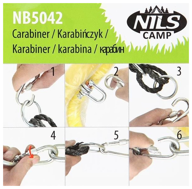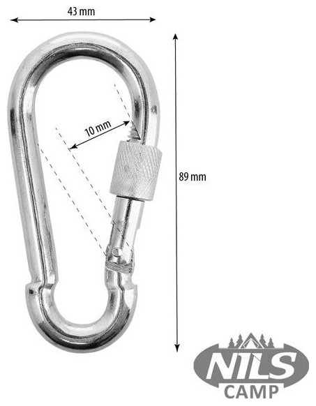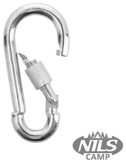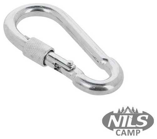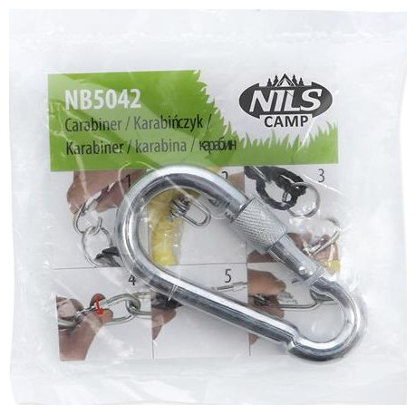 NB5042 NILS CAMP to stalowy karabińczyk, z mechanizmem zabezpieczająco skrętnym. Jego zamknięcie, to nie tylko zatrzask, ale i zakrętka. Stosunek jego wagi, do wytrzymałości jest bardzo korzystny. Produkt waży zaledwie 9 g, a jego maksymalne obciążenie to 500 kg. Bardzo łatwo się go używa. Najczęściej stosowany do łączenia lin.