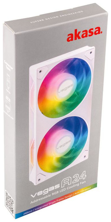 Το Akasa Vegas A24 είναι ένας ισχυρός θαυμαστής των λευκών. Ο αποδοτικός ανεμιστήρας PWM 240 mm παρέχει υψηλή δυνατότητα ψύξης και, χάρη στον απλό σχεδιασμό του, ταιριάζει τέλεια στο σύστημα υπολογιστή. Οι ενσωματωμένες, ψηφιακά διευθυνσιοδοτούμενες λυχνίες LED φωτίζουν επίσης τους ανεμιστήρες με ελκυστικό τρόπο.