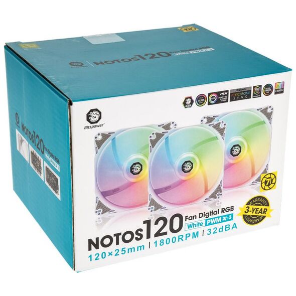 Στην περίπτωση του Notos 120, η Bitspower έδωσε ιδιαίτερη έμφαση στην αποτελεσματική ψύξη και σε μια λογική τιμή. Η μέγιστη ταχύτητα των 1800 rpm επιτρέπει τη μέγιστη μάζα αέρα. Χάρη στην καλή στατική πίεση 1,2 mm H2O, τα Notos 120 είναι επίσης κατάλληλα για χρήση μπροστά ή πίσω από την ψύκτρα. Οι λαστιχένιοι προφυλακτήρες στις γωνίες των ανεμιστήρων εξασφαλίζουν αθόρυβη λειτουργία, αποτρέποντας τους κραδασμούς και τους δυσάρεστους θορύβους ακόμη και σε υψηλές ταχύτητες.