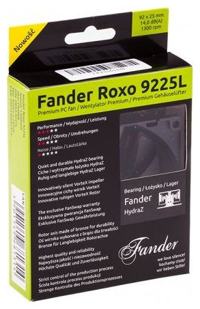 Το Fander Roxo 9225L 92 mm είναι αντιπροσωπευτικό της τρίτης γενιάς της σειράς Roxo (FRX3), που διακρίνεται από ένα εξαιρετικά αθόρυβο ρουλεμάν HydraZ και έναν άξονα ρότορα από μπρούτζο για ασυναγώνιστη αντοχή. Οι ανεμιστήρες Roxo FRX3 είναι διαθέσιμοι σε τέσσερις εκδόσεις (L - αργή ταχύτητα, M - μεσαία ταχύτητα, H - υψηλή ταχύτητα, P - έλεγχος PWM). Η τρίτη γενιά Fander Roxo χρησιμοποιεί την καινοτόμο πτερωτή VorteX, η αποστολή της οποίας είναι να διασφαλίζει την καλύτερη αναλογία ροής αέρα προς το επίπεδο θορύβου. Ο αυστηρός έλεγχος της διαδικασίας παραγωγής και η υψηλότερη ποιότητα κατασκευής μας επέτρεψαν να αυξήσουμε την αποκλειστική περίοδο εγγύησης FanSwap για τη σειρά Roxo σε τρία χρόνια. Το Fander Roxo 9225L περιστρέφεται με μέγιστη ταχύτητα περιστροφής 1300 RPM και αντλεί 35,2 CFM (59,9 m3/h) με επίπεδο θορύβου 14,0 dB(A).
