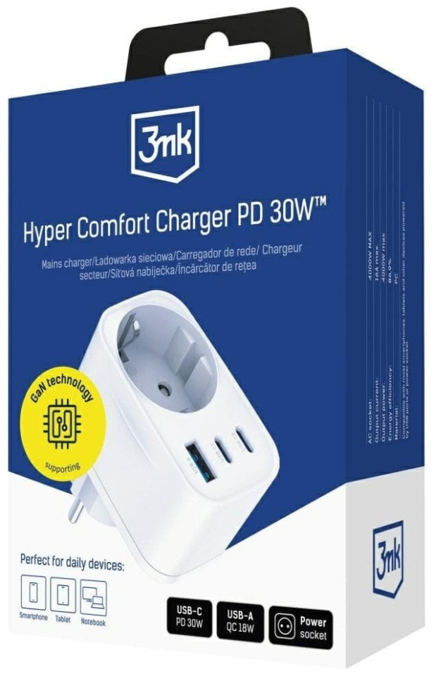 | Typ | Adapter sieciowy 3MK Hyper Comfort Charger 30W 1xUSB-A 2xUSB-C 1xSchuko PD QC3.0 biały |