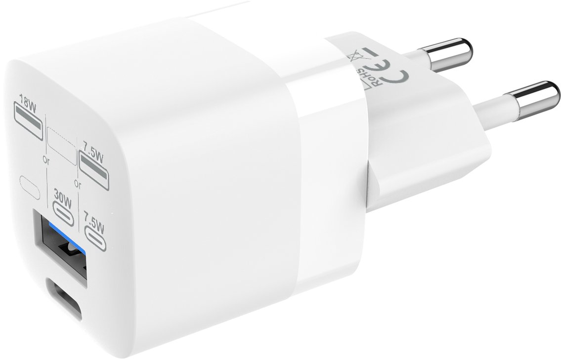 Αρχική Σελίδα/New/ Φορητοί υπολογιστές / Αξεσουάρ tablet / Φορτιστές ρεύματος/Από εργοστάσιο με πιστοποίηση MFI - 30 W - 5V 3A ή 9V 3A ή 12V 2,5A ή 15V 2A ή 20V 1,5A - Υποδοχή USB-C - Υποδοχή USB-A - EU CEE 7/7 Schuko βύσμα - Οι τρανζίστορ γαλλίου (GaN) το καθιστούν πολύ συμπαγές - γρήγορη φόρτιση με iPhone, Pro και