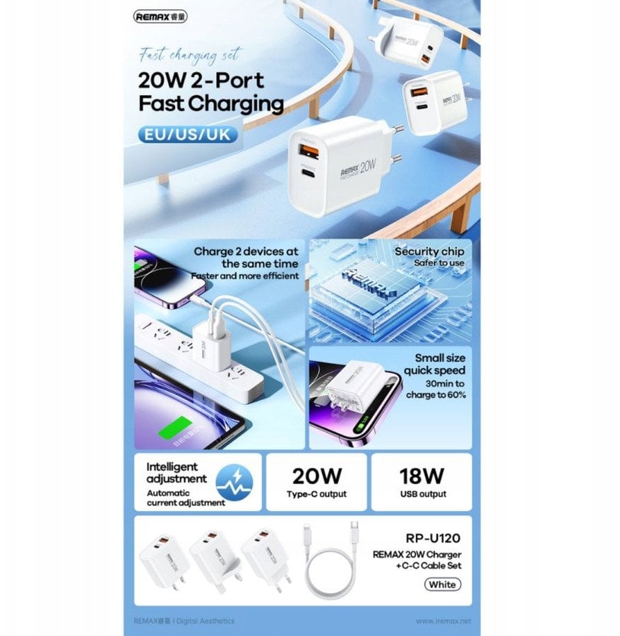 Σετ καλωδίων φόρτισης Remax 20W RP-U120 USB/USB-C + Καλώδιο USB-C/USB-C Λευκό