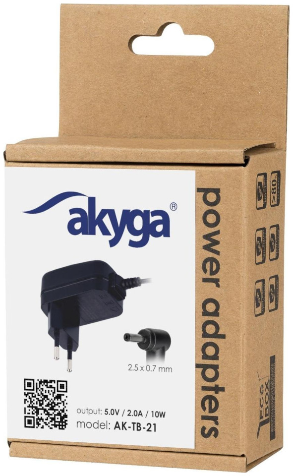 Το τροφοδοτικό Akyga® AK-TB-21 είναι μια ευέλικτη πηγή ενέργειας. Μπορεί εύκολα να φορτίσει διάφορους τύπους tablet, μίνι υπολογιστών και άλλων φορητών συσκευών. Χαρακτηρίζεται από ελαφρύ σχεδιασμό που σας επιτρέπει να χρησιμοποιείτε άνετα τη συνδεδεμένη συσκευή, αλλά και κατά τη φόρτισή της. Το τροφοδοτικό παρέχει ρεύμα 5 V/2 A και ισχύ 10 W, γεγονός που επηρεάζει θετικά την ταχύτητα των συσκευών φόρτισης. Επιπλέον, ένα μακρύ καλώδιο 1,5 m με βύσμα 2,5 x 0,7 mm εξασφαλίζει ελευθερία κινήσεων κατά τη χρήση.