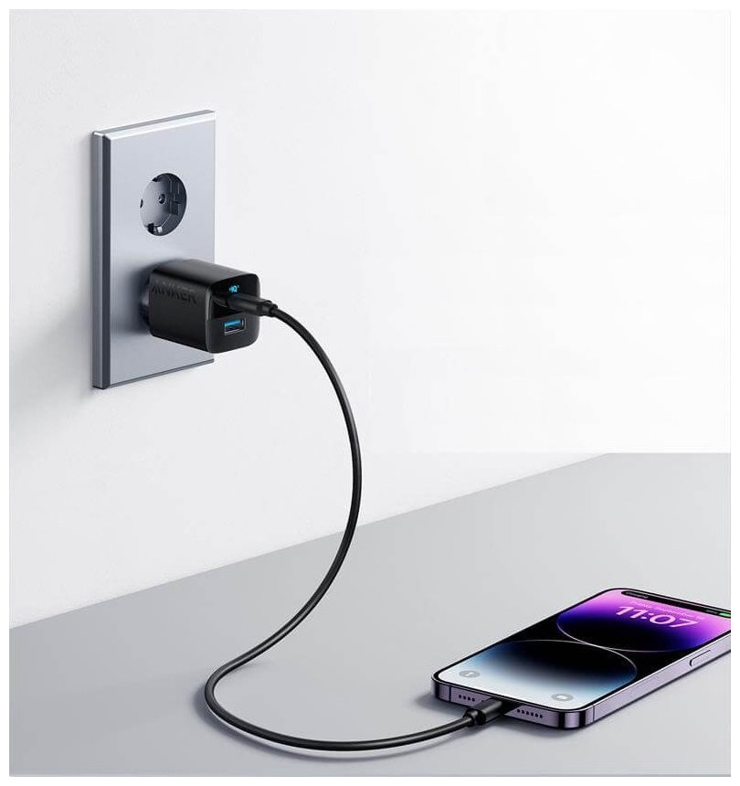 Ładowarka Anker 323 33W 1x USB-A 1x USB-C Błyskawiczne ładowanie: wyposażony w złącze USB C o mocy 33 W, ładuje smartfony, tablety i nie tylko do 3 razy szybciej niż oryginalna ładowarka. 2 w 1: dzięki złączu USB C i jednemu portowi USB-A możesz ładować do 2 urządzeń jednocześnie. Błyskawiczne ładowanieNajwyższy poziom bezpieczeństwa Kompaktowa i poręczna Super kompaktowa konstrukcja idealnie nadaje się do podróży i łatwo mieści się w kieszeni.2 w 1 Dzięki złączu USB C i jednemu portowi USB-A możesz ładować do 2 urządzeń jednocześnie.Specyfikacja • Wejście: AC, 100-240V, 50-60Hz, 1A Мах • Wyjście: - USB-C, 5V/3A; 9V/3A; 11V/3A; 15V/2.2A; 20V/1.65A (33W max) - USB-A: 4.5V/5A; 5V/4.5A; 5V/3A; 9V/3A; 11V/3A; 12V/2.5A; 20V/1.5A (33W max) - USB-C + USB-A: 20W + 12W (33W Max)