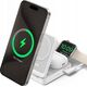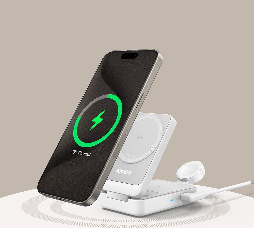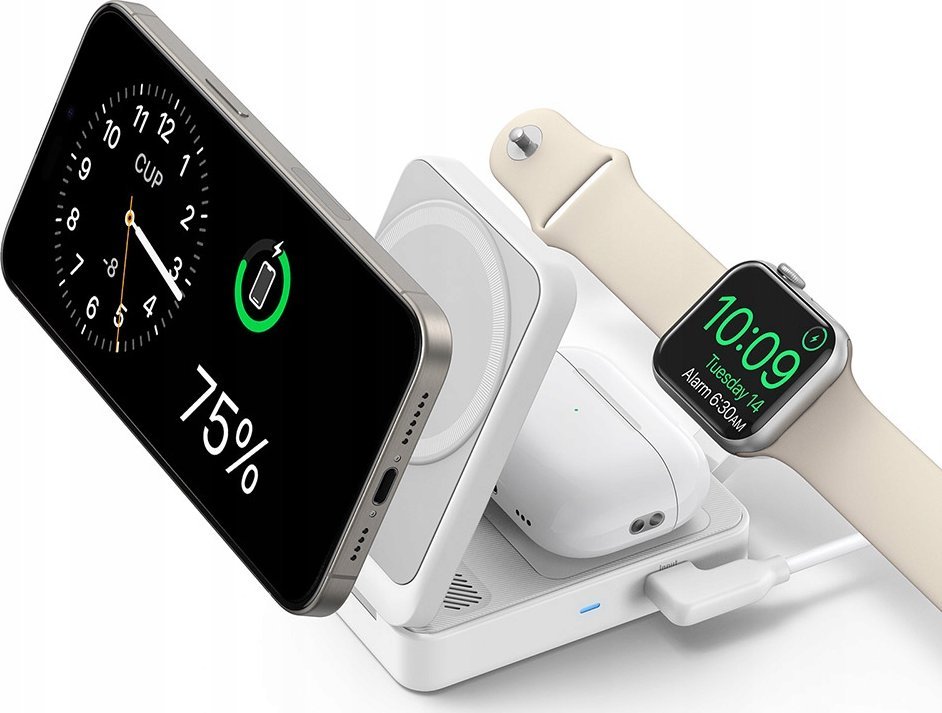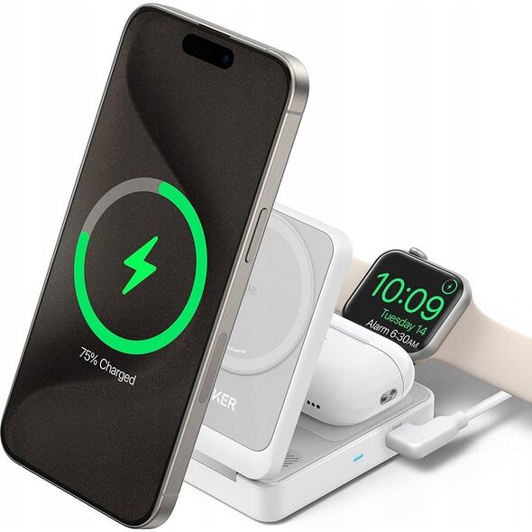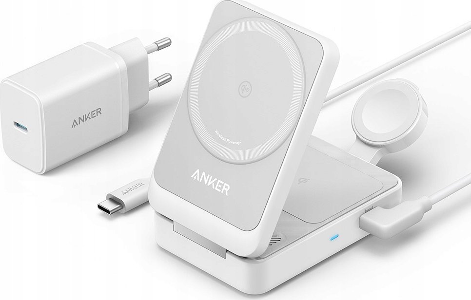 Ładowarka magnetyczna Anker MagGo 15W 3w1 białaŁadowarka MagGo 15W 3 w 1 została stworzona z myślą o ładowaniu do trzech mobilnych urządzeń Apple jednocześnie. Dzięki wykorzystaniu technologii Qi2 ładowanie może być krótsze nawet o połowę. Niewielkie rozmiary tego urządzenia pozwalają zaoszczędzić miejsce na komodzie, biurku, plecaku czy torbie.Ładuj urządzenia 2 razy szybciejNiezawodny bezprzewodowy system PowerIQ pozwoli ładować iPhone'a ze zdwojoną prędkością.Oficjalnie certyfikowane szybkie ładowanie dla Apple WatchUrządzenie posiada oficjalne wsparcie Apple, dzięki czemu ładowanie zegarka do połowy pojemności baterii zajmie niecałe 30 minut.Jednoczesne ładowanie do 3 urządzeńZamiast używać 3 osobnych ładowarek czy kabli wystarczy jedna ładowarka 3 w 1. Dzięki temu można zaoszczędzić dużo miejsca na biurku czy komodzie.Kompaktowa konstrukcjaZabierz ładowarkę 3 w 1 ze sobą na wakacje czy ważne spotkania biznesowe. Wymiary ładowarki to zaledwie 9 x 6 x 2,5 cm.Uniwersalna kompatybilnośćUrządzenie oferuje wsparcie dla iPhone’ów z MagSafe włącznie z etui MagSafe, wszystkimi modelami Apple Watch oraz AirPods’ów posiadających etui z możliwością ładowania bezprzewodowego.Zaawansowana ochrona przed przegrzaniemTechnologia ActiveShield 2.0, która kontroluje wysokość temperatury urządzenia nawet 3 000 000 razy, zapewnia optymalną temperaturę podczas sesji ładowaniaWłasny system bezpieczeństwaŁadowarka MagGo oferuje wykrywanie ciał obcych podczas ładowania, ochrona przed promieniowaniem, przepięciem i przeciążeniem.Dane techniczne: Moc wejściowa: 12V=3A/15V=2.66A Moc wyjściowa: max 15W (iPhone: 15W, Apple Watch: 5W, Airpods: 5W) Wymiary (mm)89 x 60 x 25 Waga: 195,6 g