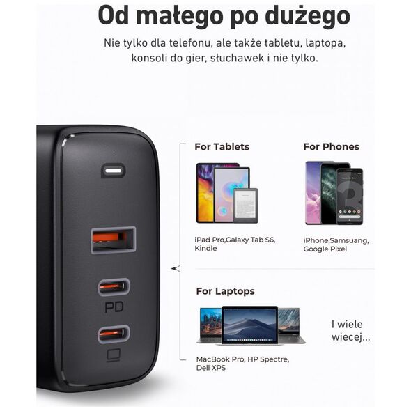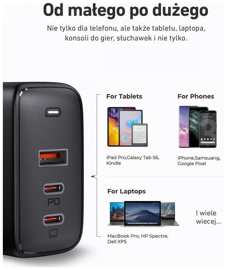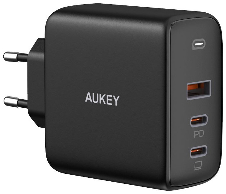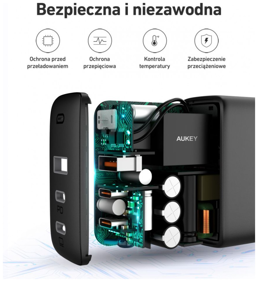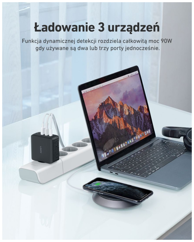 Aukey PA-B6S Omnia Mix3 – energooszczędna ładowarka sieciowa trójportowa Ta kompaktowa i niezwykle wydajna ładowarka jest aż o 20% mniejsza niż ładowarka 87 W marki Apple, mimo że posiada trzy razy większą liczbę portów. Zużywa też aż o 40% mniej energii. Model idealnie sprawdzi się w przypadku 15-calowych MacBooków Pro oraz innych laptopów i urządzeń z obsługą USB-C (m.in. najnowszych wersji iPhone’ów). Wyposażony został w port USB-C o bardzo dużej mocy (szybkie ładowanie 90 W Power Delivery 3.0). Przez port USB-A można za pomocą tej ładowarki naładować z mocą 45 W np. telefon Samsung Galaxy Note20 Ultra lub S20+. Dlaczego jeszcze warto zdecydować się na ten właśnie model? Czytaj dalej, a poznasz więcej szczegółów. Kompaktowe wymiary, składana wtyczka, wysokiej jakości materiały Jeśli szukasz ładowarki, której konstrukcja sprawia, że jest ona naprawdę komfortowa w podróży, trójportowa ładowarka sieciowa Aukey PA-B6S Omnia Mix3 spełni Twoje oczekiwania. I to nie tylko z uwagi na swój kompaktowy rozmiar (64 x 62 x 33 mm), ale także z racji tego, że model ten wyposażony został w składaną wtyczkę, która nie porysuje innego sprzętu, który trzymał będziesz w swojej torbie czy plecaku. Co oczywiste, ładowarka zajmie przez to również mniej miejsca. A ponieważ jej design jest minimalistyczny i utrzymany w czarnej kolorystyce, świetnie zgra się z każdym praktycznie wyposażeniem – w domu, w biurze, a także podczas bliższych i dalszych wyjazdów. Nie można nie wspomnieć też o wysokiej jakości materiałach, jakie wykorzystano do produkcji – to model bardzo odporny na uszkodzenia, który posłuży Ci przez wiele kolejnych lat. Ładowanie do trzech urządzeń jednocześnie Tak – za pomocą szybkiej ładowarki Aukey PA-B6S Omnia Mix3 możesz ładować nawet do trzech urządzeń w tym samym czasie! Model oferuje szybkie ładowanie 90 W Power Delivery 3.0 z portu USB-C, a także ładowanie z USB-A z mocą 45 W. Podczas używania wszystkich trzech portów jednocześnie, port główny USB-C zapewnia do 60 W, natomiast pozostałe porty do 12 W. Używając tej ładowarki z łatwością utrzymasz swoje urządzenia w pełnej gotowości do działania, a w razie potrzeby szybko je naładujesz lub podładujesz. Szeroka kompatybilność Szybka ładowarka Aukey PA-B6S Omnia Mix3 bezproblemowo współpracuje z większością laptopów z wejściem USB-C oraz z innymi urządzeniami PD. Będzie kompatybilna m.in. z MacBook Pro 16”, MacBook Air, iPhone 12 / 12 Pro / 12 Pro Max / SE, Samsung S20+ / NOTE 20+, Google Pixel 4 / 3 XL, LG G7 / V50, AirPods Pro, Switch, iPad Pro 2020, iPad Air 2020, iPad mini 2020 oraz Airpods Pro. Dane techniczne Wejście: AC 100–240V 50/60Hz 2A Wyjście: USB-C 1/2: 3.3-11V/5A (PPS) 5V/3A, 9V/3A, 12V/3A, 15V/3A, 20V/4.5A (Max 90W) USB-A: 4.5V/5A, 5V/4.5A, 9V/3A, 12V/3A, 20V/3A (Max 60W) USB-C 1 + USB-A: 60W + 30W (Max 90W) USB-A 1 + USB-A 2: 12W + 12W (Max 24W) USB-C 1 + USB-C 2: 60W + 30W (Max 90W) USB-C 1 + USB-C 2 + USB-A: 60W + 12W + 12W (Max 84W) Maksymalna moc wyjściowa: 90W Wymiary: 64 x 62 x 33 mm Waga: 190 g
