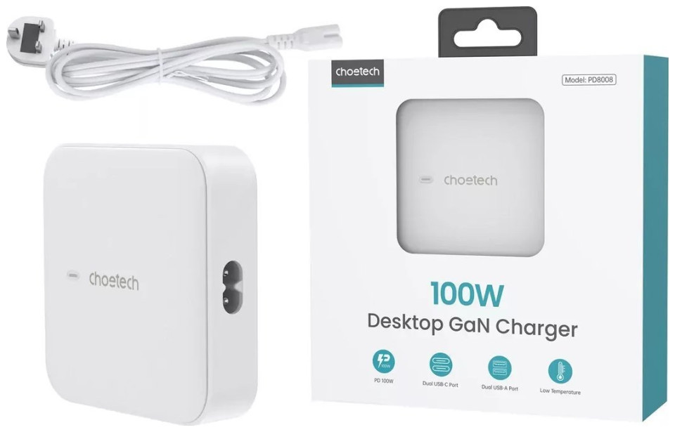 Szybka ładowarka sieciowa GaN Choetech PD8008 100W 2x USB-A / 2x USB-C - biała
