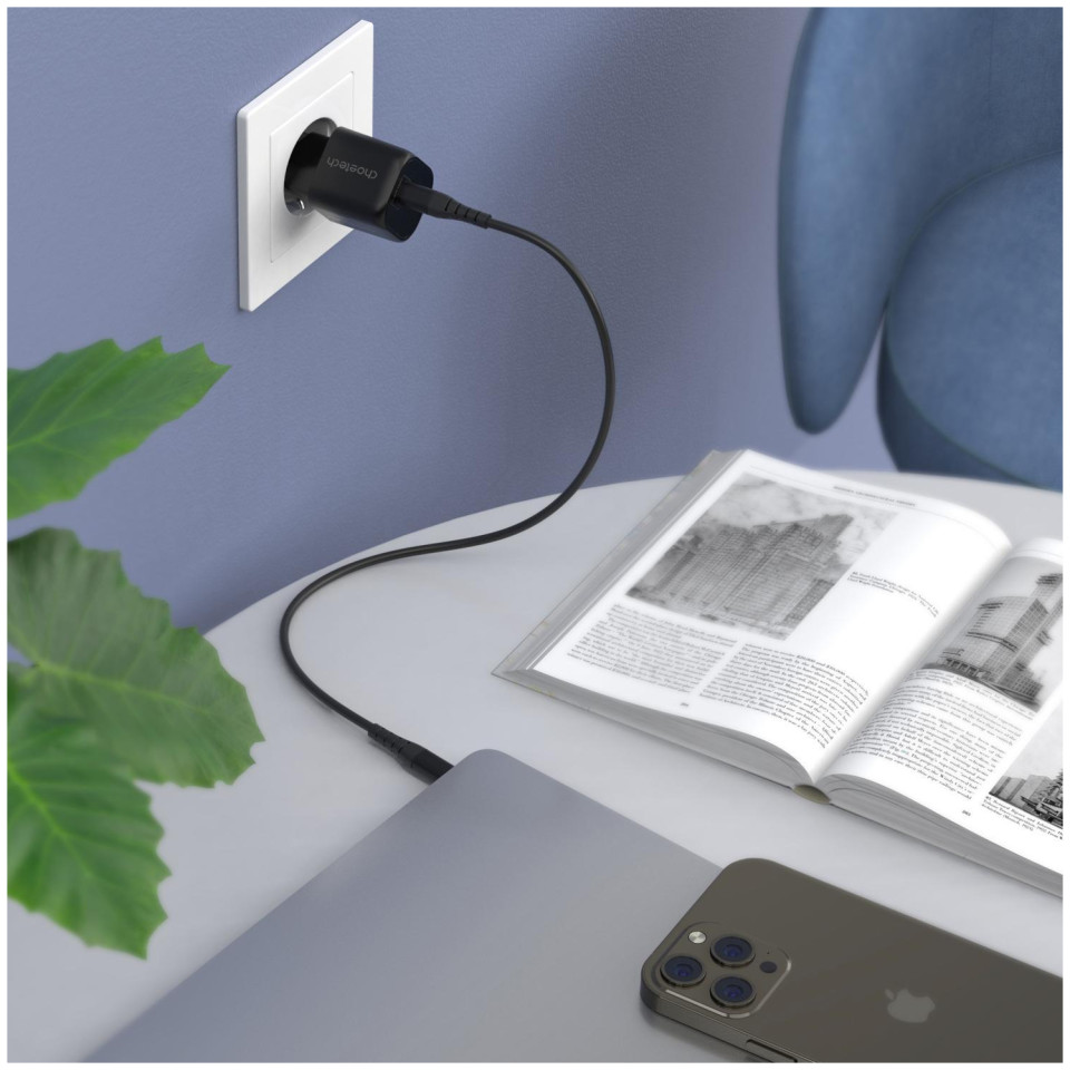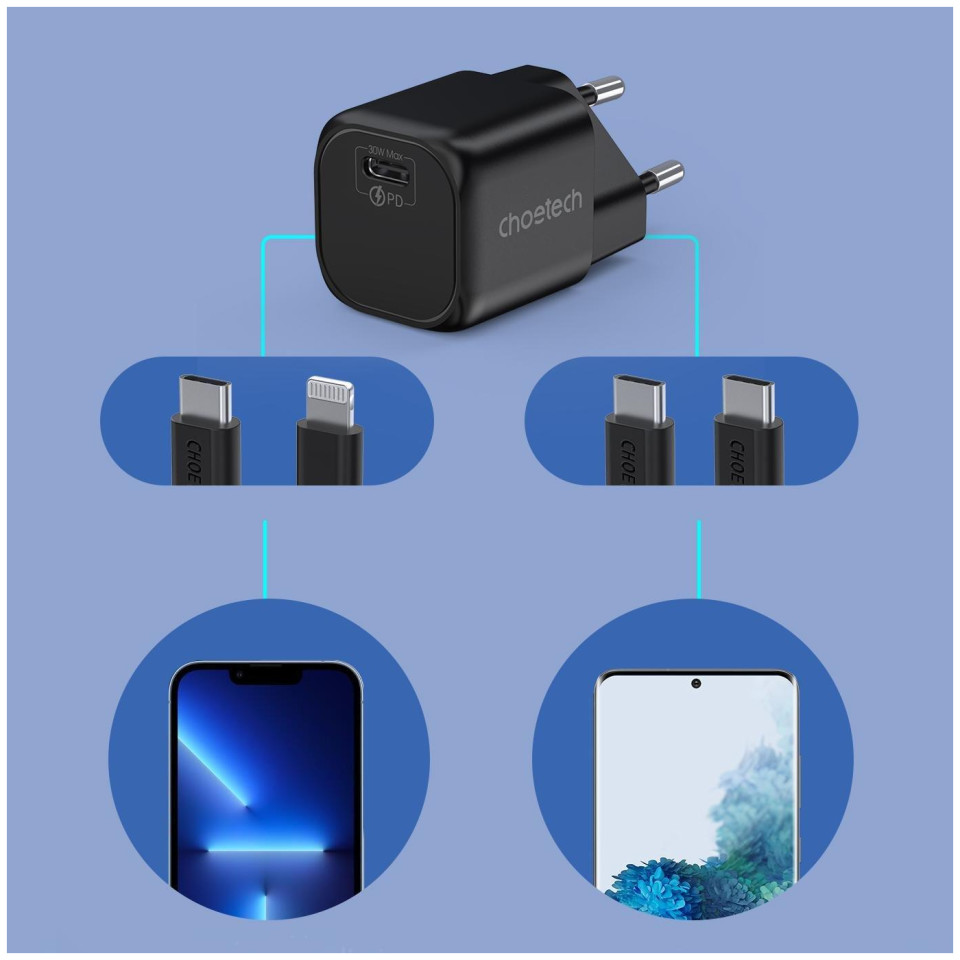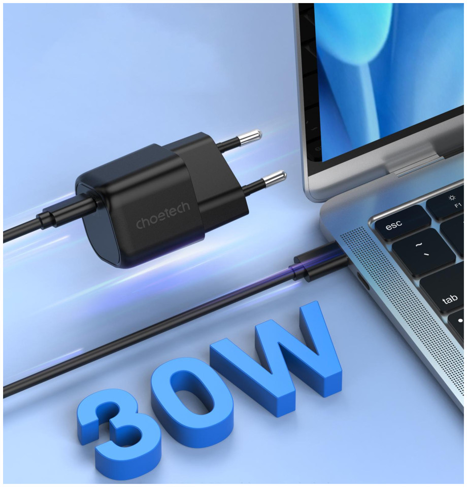 Szybka ładowarka sieciowa GaN marki Choetech wyposażona w port USB Typ C, który umożliwia ładowanie z mocą do 30W. Pozwala na szybkie ładowanie urządzeń w standardzie PD (Power Delivery). Została wyposażona w wiele zabezpieczeń takich jak np. przed przegrzaniem, przepięciem, wysokim napięciem czy przeciążeniem. Elektroniczne komponenty ładowarki zostały wykonane w technologii GaN czyli są oparte na azotku galu, a nie na krzemie. GaN to lepsza efektywność pracy i mniejsze zużycie energii.