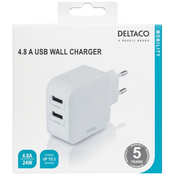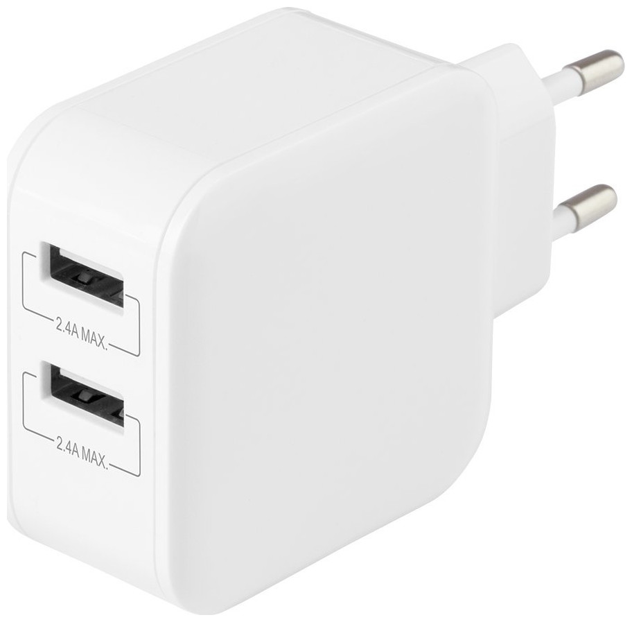 Φορτιστής Deltaco DELTACO USB φορτιστής τοίχου, 2x USB-A 2,4 A, συνολικά 24 W, λευκός USB-AC175