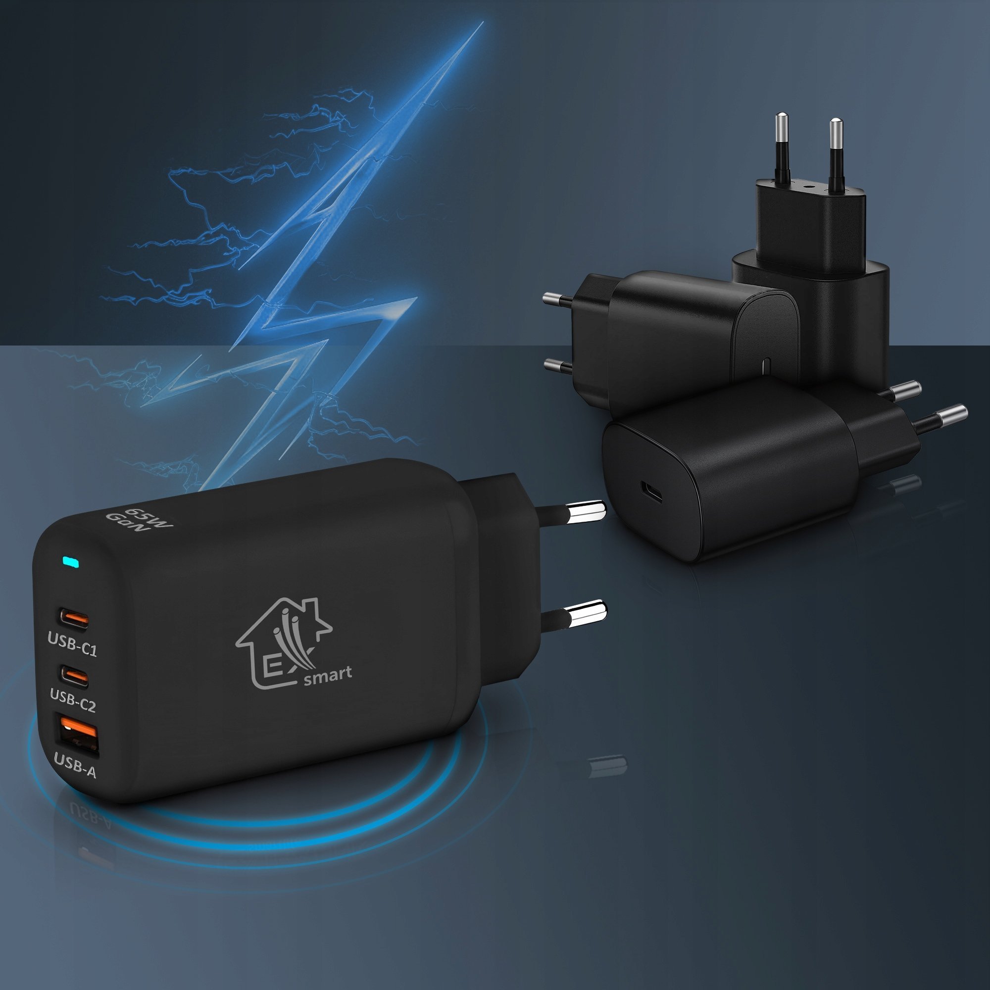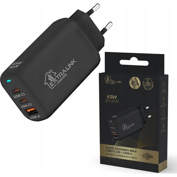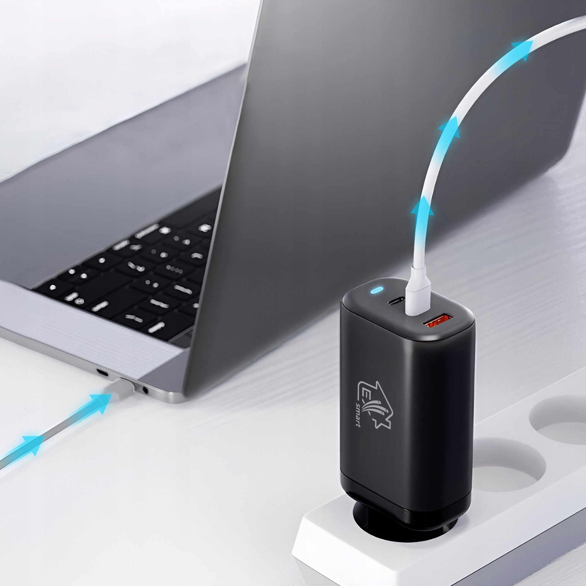Ładowarka SIECIOWA USB C Smart Life Fast Charger 65W GaN 3 PORTY 3w1 EAN: 5906168630446Moc i szybkość ładowania Ładowarka Extralink Smart Life GaN Charger 65W, łączy w sobie potężną moc i zaawansowaną technologię GaN. Posiadająca jeden port USB-A oraz dwa porty USB-C, gwarantuje szybkie i bezproblemowe ładowanie aż do 50% w 30 minut.Dostosowana do Twoich potrzeb Dzięki zastosowaniu technologii GaN (gallium nitride), nasza ładowarka łączy w sobie kompaktową budowę z maksymalną wydajnością. GaN umożliwia bardziej efektywne przetwarzanie energii, co przekłada się na mniejsze straty ciepła i bardziej kompaktowy design, idealny dla osób, które cenią sobie nowoczesność.Brak ograniczeń Ładowarka Extralink to prawdziwy multitasking w świecie ładowania. Posiada jeden port USB-A oraz dwa porty USB-C, dzięki czemu nie musisz się ograniczać do ładowania tylko jednego urządzenia. Wygodne i praktyczne rozwiązanie dla wielozadaniowych użytkowników, którzy nie chcą tracić czasu na ładowanie pojedynczych urządzeńZapomnij o obawach związanych z przegrzewaniem czy przeciążeniem. Technologia Fast Charge dostosowuje się do potrzeb każdego urządzenia, zapewniając efektywne, szybkie i bezpieczne ładowanie. Zainwestuj w ładowarkę, która myśli o Twoich urządzeniach.Dane techniczne Marka: Extralink Model: CHARESL02 Napięcie wejściowe: 240V Napięcie wyjściowe: 5V/3A 9V/3A 12V/3A 15V/3A 20V/3.25A Całkowita moc wyjściowa: 65W