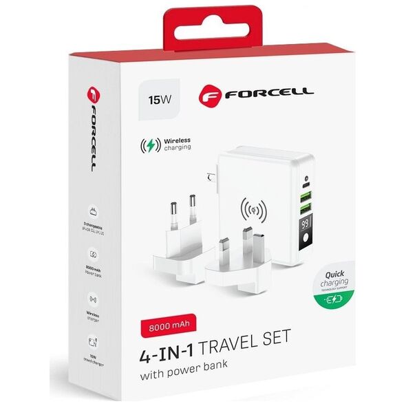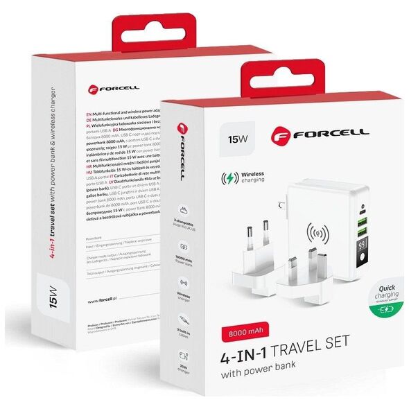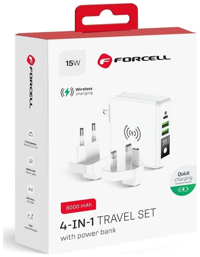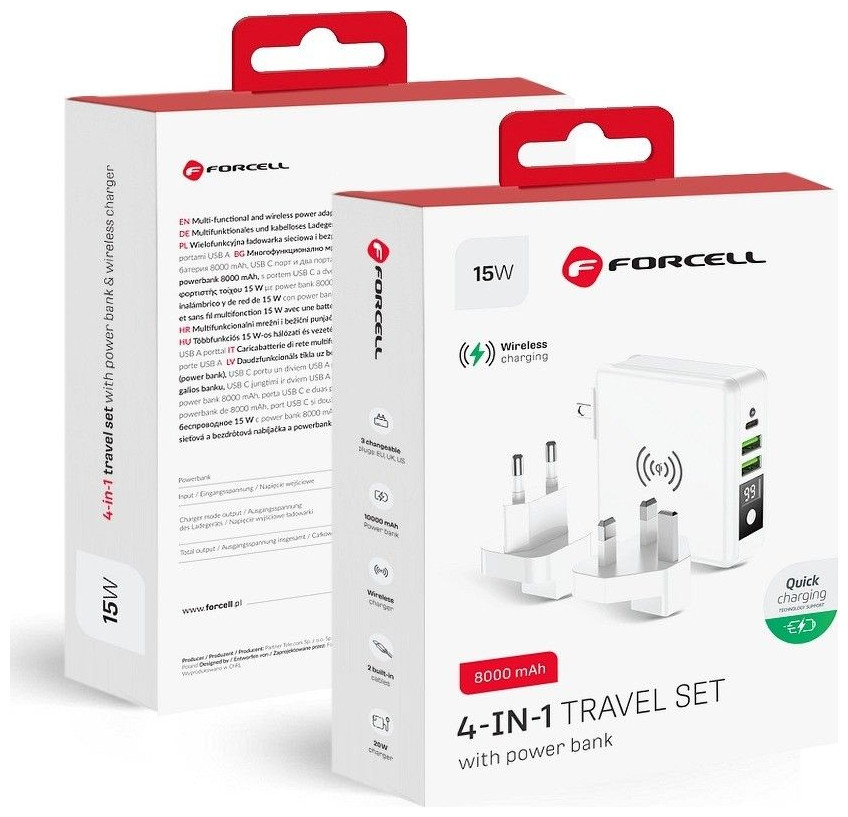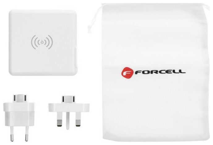 Τέλειο σετ ταξιδιού: FORCELL 4in1 πολυλειτουργικός φορτιστής. Εξοπλισμένο με ενσωματωμένες υποδοχές: USB-USB-C και power bank. Επιτρέπει την επαγωγική φόρτιση. Ενσωματωμένες θύρες: 2x USB και USB C, σας επιτρέπουν να φορτίζετε πολλές διαφορετικές συσκευές ταυτόχρονα. Ένα σύνολο 3 εναλλάξιμων συμβουλών: Η.Β., ΗΠΑ, ΕΕ, σας επιτρέπει να χρησιμοποιείτε διάφορες πηγές ενέργειας σχεδόν οπουδήποτε στον κόσμο. Η ασύρματη (επαγωγική) φόρτιση σάς επιτρέπει να φορτίζετε συσκευές χωρίς να χρειάζεται να συνδέσετε καλώδιο. Το ενσωματωμένο power bank (8.000 mAh) με υψηλή χωρητικότητα σάς επιτρέπει να τροφοδοτείτε πολλές φορές συσκευές εκτός της πρόσβασης σε πηγή τροφοδοσίας. Υποστηριζόμενα πρότυπα φόρτισης: Quick Charge 3.0, επιτρέπουν την άμεση φόρτιση συσκευών που υποστηρίζουν τις προαναφερθείσες λειτουργίες. Η ενσωματωμένη οθόνη δείχνει την τρέχουσα κατάσταση φόρτισης του power bank.{Amperage} 3 A . {Amperage} 3 A . {Amperage} 3 A . {Amperage} 3 A . {Cable length} Δεν ισχύει. {Cable length} Δεν ισχύει. {Cable length} Δεν ισχύει. {Cable length} Δεν ισχύει. {Charger type} Προσαρμογέας δικτύου . {Charger type} Προσαρμογέας δικτύου . {Charger type} Προσαρμογέας δικτύου . {Charger type} Προσαρμογέας δικτύου . {Αριθμός εξόδων USB-A} 2 . {Αριθμός εξόδων USB-A} 2 . {Αριθμός εξόδων USB-A} 2 . {Αριθμός εξόδων USB-A} 2 . {Cable connector type} Δεν ισχύει . {Cable connector type} Δεν ισχύει . {Cable connector type} Δεν ισχύει . {Cable connector type} Δεν ισχύει . {Αριθμός εξόδων USB-C} 1 . {Αριθμός εξόδων USB-C} 1 . {Αριθμός εξόδων USB-C} 1 . {Αριθμός εξόδων USB-C} 1 . {Quick Charge} Ναι. {Quick Charge} Ναι. {Quick Charge} Ναι. {Quick Charge} Ναι. {Χρώμα} Λευκό . {Χρώμα} Λευκό . {Χρώμα} Λευκό . {Χρώμα} Λευκό . {Αριθμός φορτισμένων συσκευών} 4 . {Αριθμός φορτισμένων συσκευών} 4 . {Αριθμός φορτισμένων συσκευών} 4 . {Αριθμός φορτισμένων συσκευών
