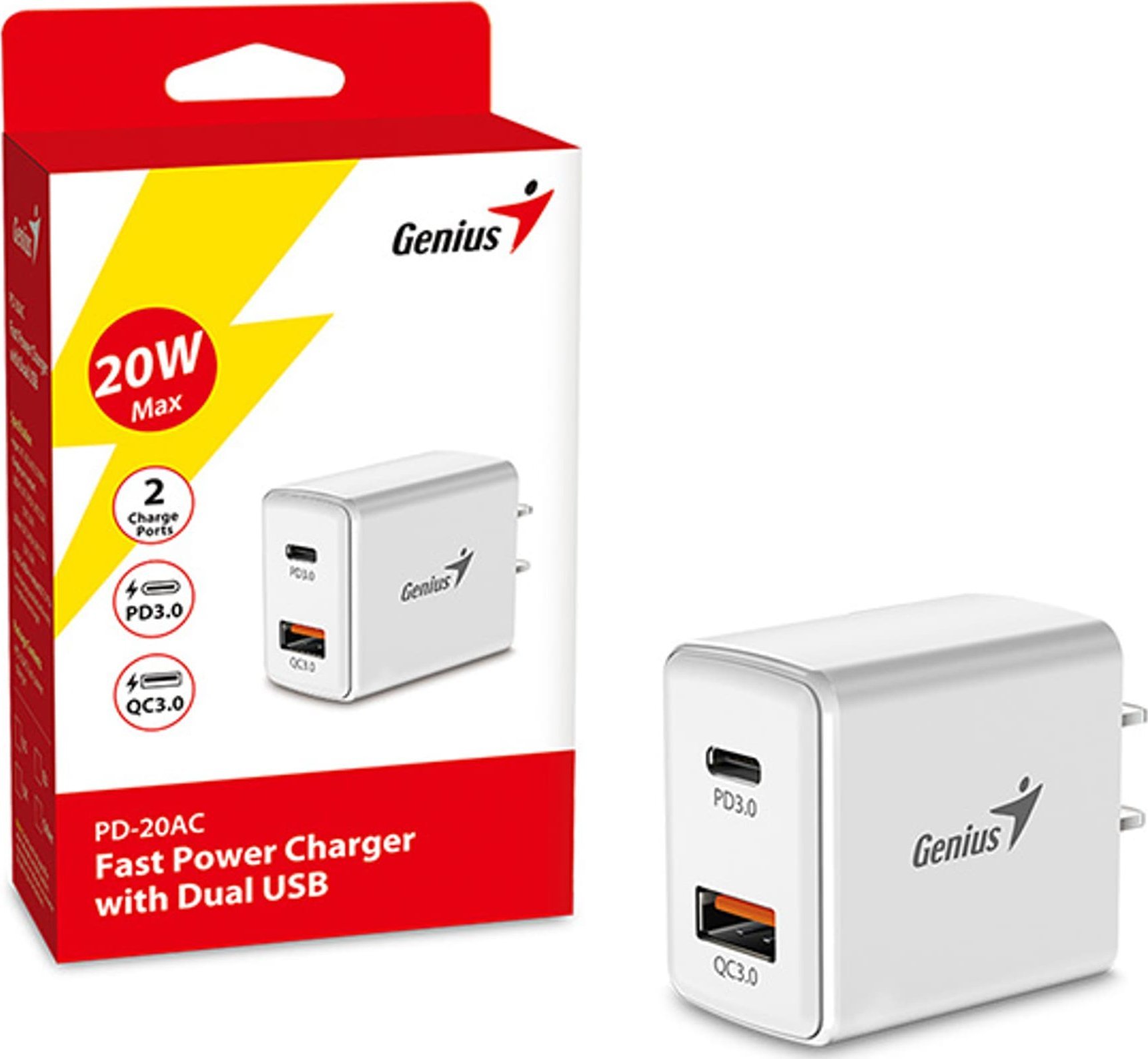 Φορτιστής Genius GENIUS PD-20AC, 20W, γρήγορη φόρτιση, USB-C PD3.0, USB-A QC3.0, λευκό
