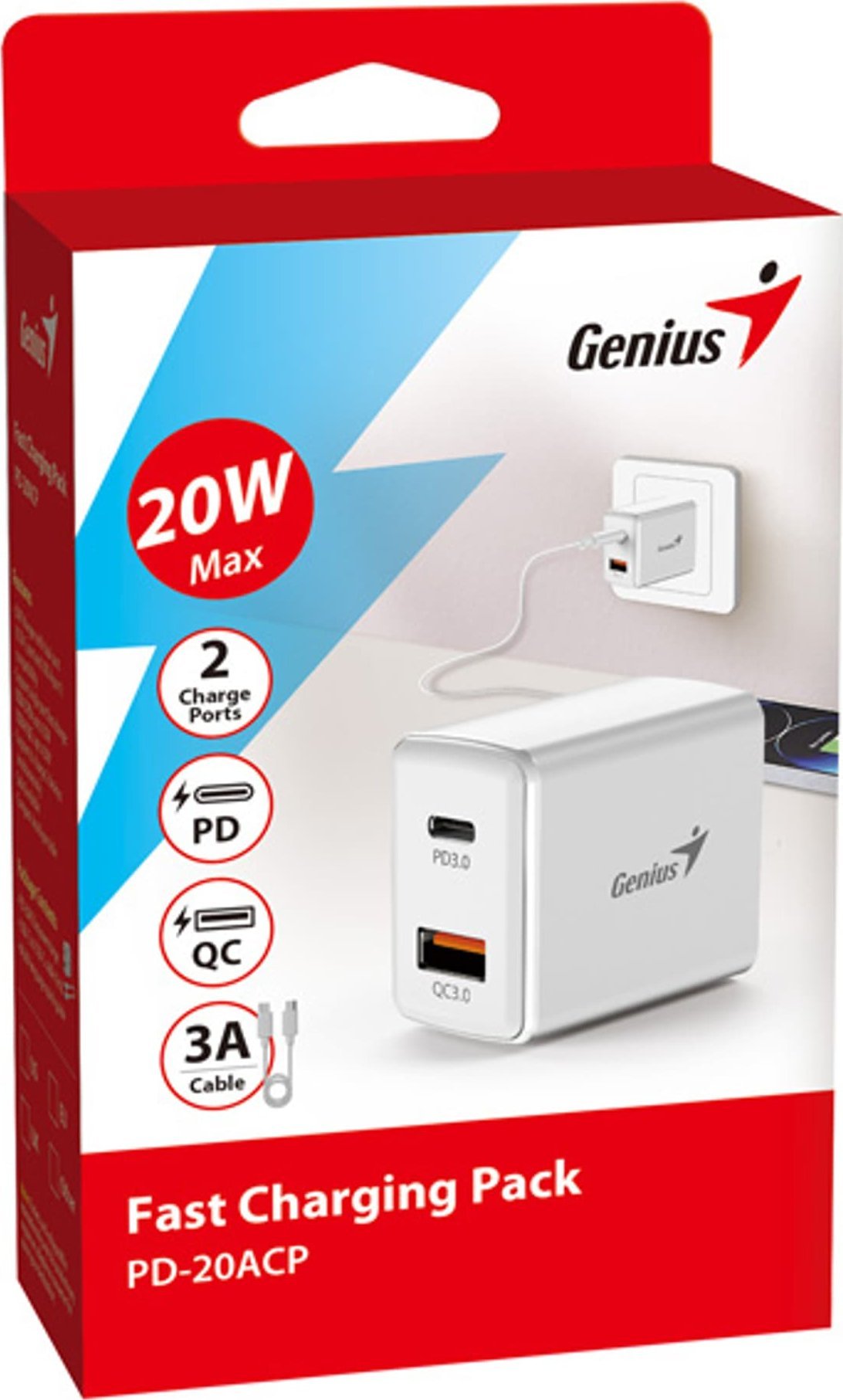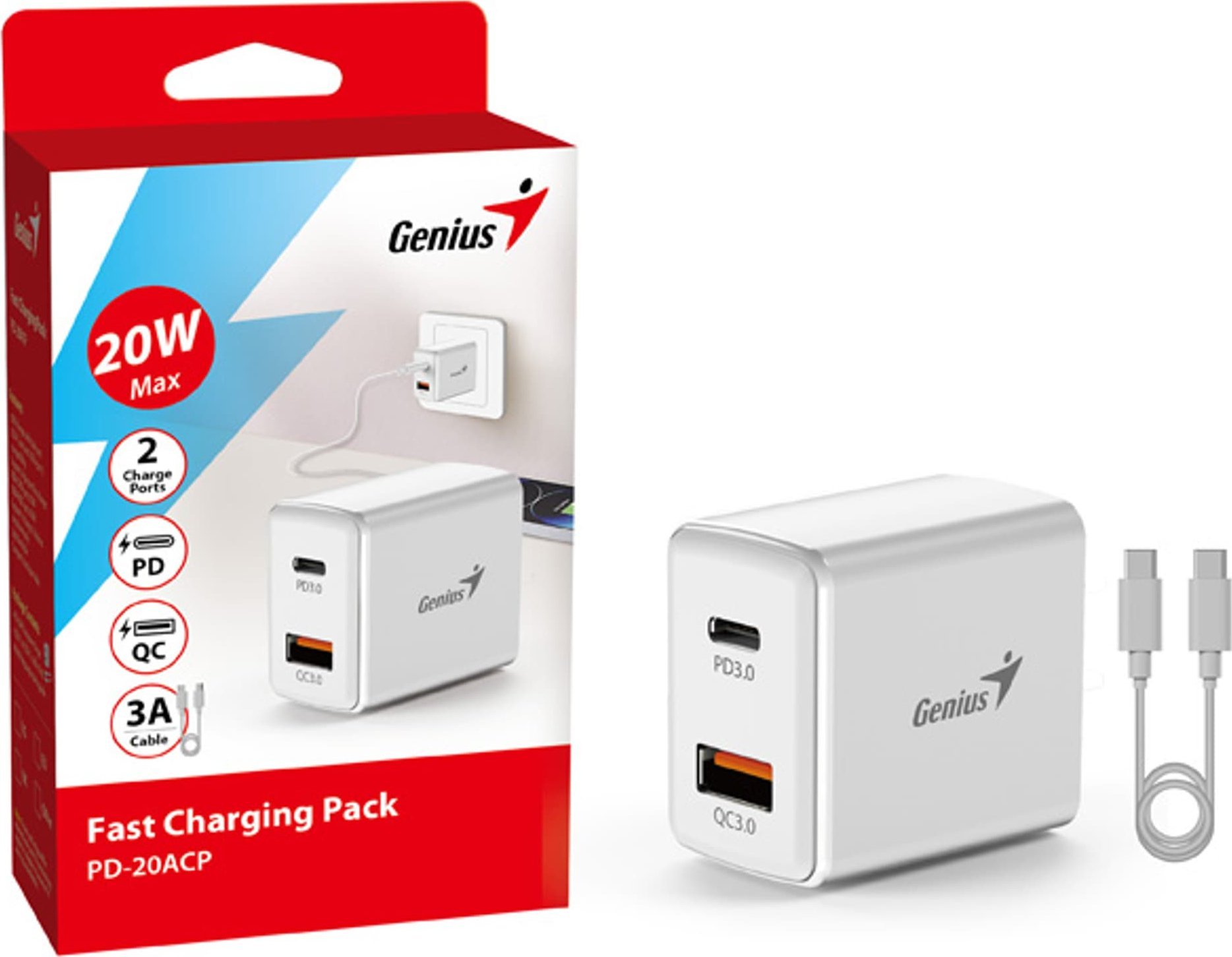 Φορτιστής Genius Genius Τροφοδοτικό / προσαρμογέας δικτύου 20W, 2-θυρών, USB-C, USB-A, PD-20ACP