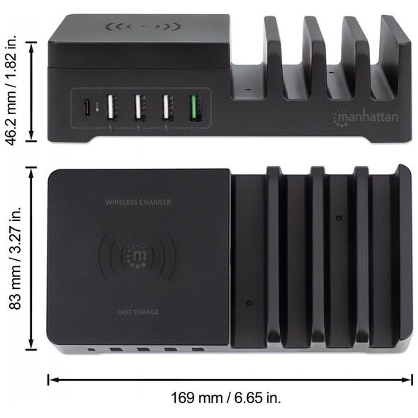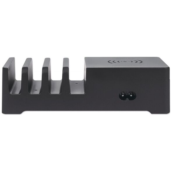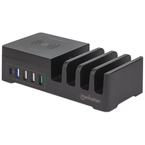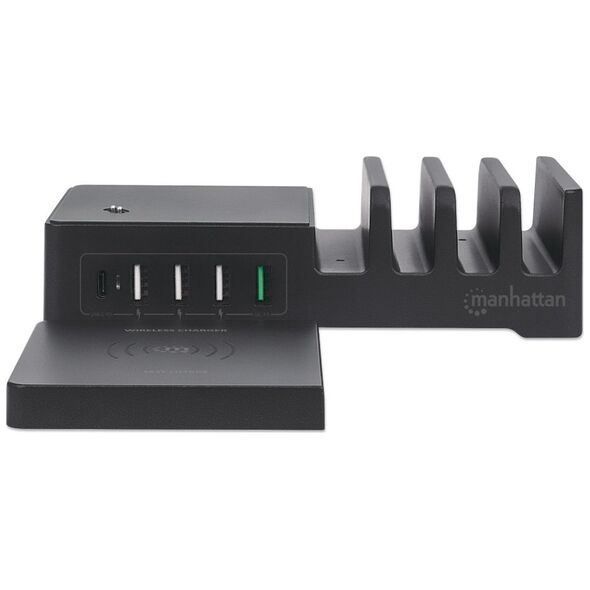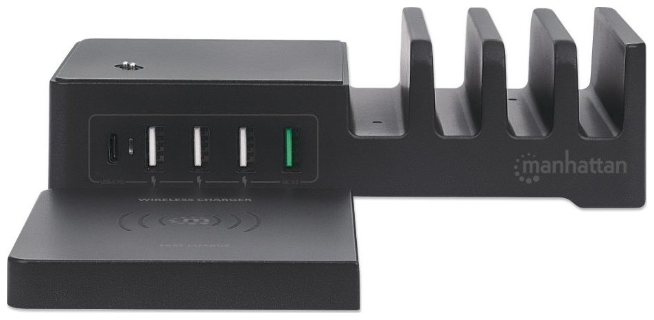 Sieciowa Stacja Zasilająca, Ładująca 55W – 1x USB-C PD 30W, 1x USB-A QC 3.0 18W, 3x USB-A 5V 2,4A (36W) oraz Bezprzewodowa Ładowarka Indukcyjna Qi 10W Opis produktu:Certyfikat zgodności z Qi™ gwarantuje bezpieczeństwo podczas ładowania zarówno dla użytkownika jak i urządzeniaStacja ładowania z jednym portem USB-C Power Delivery (PD 3.0), jednym portem USB-A Quick Charge™, trzema portami USB-A oraz odłączaną bezprzewodową ładowarką Qi™ 10WZasilanie oraz ładowanie różnych urządzeń jednocześnie ze zoptymalizowaną alokacją mocyOdłączana bezprzewodowa ładowarka 10W z certyfikatem Qi™Jeden port USB-C Power Delivery zapewnia do 30W mocy do zasilania i ładowania notebooka, laptopa, Ultrabook™, tabletu lub innego urządzenia zasilanego przez USB-CJeden port USB-A Quick Charge zapewnia do 18W mocy do zasilania i ładowania urządzenia przenośnegoTrzy porty USB-A o łącznej mocy do 36W z których każdy może ładować prądem do 5V / 2.4AZabezpieczenie przeciążeniowe, przetężeniowe oraz przed przegrzaniemDiodowa sygnalizacja statusu urządzeniaKompaktowa oraz stylowa konstrukcja, idealna do użycia na każdym biurkuGwarancja 3 lata Standardy & certyfikaty:Qi™USBPower Delivery 3.0Qualcomm® Quick Charge™ 3.0CEFCCRoHSWEEEETL Porty:1x USB-C Power Delivery (PD 3.0)1x USB-A Quick Charge 3.03x USB-AOdłączana ładowarka bezprzewodowa Qi 10W Parametry techniczne:Napięcie wejściowe AC: 100 - 240V 50/60HzNapięcie wyjściowe USB-C: 5 - 20V, maksymalnie 3A, 30WNapięcie / natężenie prądu (maksymalne):USB-C PD 30W:5V / 3A9V / 3A12V / 2.5A15V / 2A20V / 1.5AUSB-A QC 3.0 18W:3.6 - 6V / 3A6 - 9V / 2A9 - 12V / 1.5AUSB-A5V / 2.4AŁadowarka bezprzewodowa Qi 10W:Napięcie wejściowe 5V / 2A: 5WNapięcie wejściowe 9V / 2A: do 10W Charakterystyka napięcia wejściowego:Napięcie znamionowe AC: 100 - 240VZakres częstotliwości: 50 - 60Hz (± 1Hz)Natężenie: ≤ 1A przy 100V AC 60Hz Charakterystyka napięcia wyjściowego:Napięcie znamionowe: 5 / 9 / 12 / 15 / 20VNatężenie: maksymalnie 3A (w trybie napięcia stałego)Ładowanie bezprzewodowe (maksymalnie): 5W / 7.5W / 10WMoc znamionowa: 55W maksymalnieOdchylenie napięcia od normy: ≤5% Charakterystyka zabezpieczeń:Przeciw zwarciowe (SCP) z trybem automatycznego wznowienia pracyPrzeciw przepięciowe (OVP) z trybem automatycznego wznowienia pracyPrzeciw przetężeniowe (OCP) - maksymalna wartość prądu: 150%Przeciw przegrzaniu (OTP) Parametry fizyczne:Wymiary: 16.9 x 8.3 x 4.62 cmWaga: 0,22 kgObudowa: plastikowa Warunki otoczenia:Temperatura pracy: 0 - 30°C (32 - 86°F)Temperatura magazynowania: -20 - 65°C (-4 - 149°F)Wilgotność (bez kondensacji): 10 - 90% Kompatybilność ładowarki bezprzewodowej:Tryb szybkiego ładowania 10W:Samsung Galaxy S7 / S7 Edge / S8 / S8+ / S9 / S9+ / S10 lub nowszeSamsung Note 8 / 9 / 10 lub nowszeTryb ładowania 7.5W:Apple iPhone 8 / 8 Plus / X / XR / XS / XS Max lub nowszeTryb ładowania 5W:Inne urządzenia obsługujące standard ładowania bezprzewodowego Qi™ Wymagania dla ładowarki bezprzewodowej:Moc wyjściowa do 10W:Zasilacz Quick Charge 2.0 / 3.0Zasilacz Power Delivery 18WMoc wyjściowa 5W:Zasilacz 5V / 2A Zawartość opakowania:Stacja zasilająca Power Delivery z ładowarką indukcyjną Qi - 55WKabel zasilający 1mKabel USB-A męski na USB Micro-B męski 1mInstrukcja szybkiej instalacji