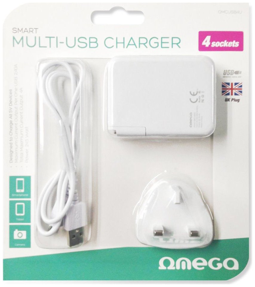 Φορτιστής με 4 υποδοχές USB συμβατός με αγγλικές πρίζες ρεύματος. Σχεδιασμένο για να φορτίζει φορητές συσκευές όπως smartphone και tablet. Μέγιστο ρεύμα σε κάθε θύρα USB: 2,4A Μέγιστο ρεύμα σε όλες τις θύρες: 4,9A Μη εύφλεκτο πλαστικό περίβλημα υψηλής ποιότητας.