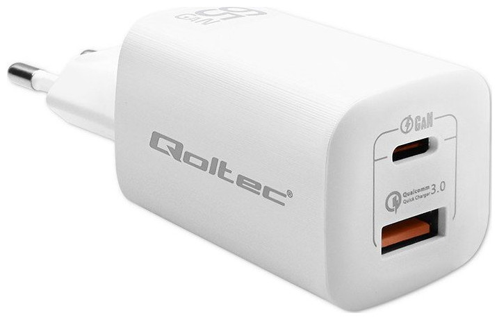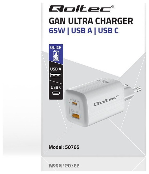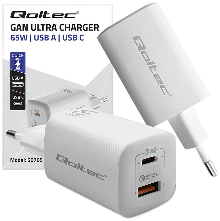 Φορτιστής QOLTEC Φορτιστής τοίχου 65W GaN ULTRA | 5-20V | 2.25-3.25A | 1 x USB τύπου C PD | 1 x USB QC 3.0 | Λευκός