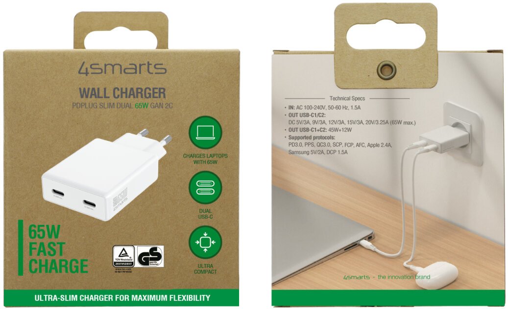 Φορτιστής τοίχου 4smarts PDPlug Slim Dual 65W GaN 2xUSB-C λευκό