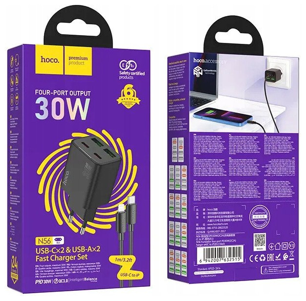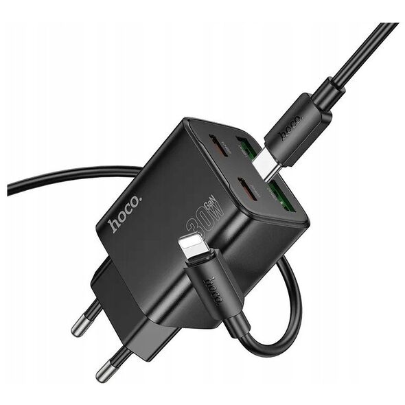 Φορτιστής τοίχου για τηλέφωνο HOCO 2 x USB C + 2 x USB A QC3.0 PD 3A 30W + καλώδιο USB C σε Lightning N56 μαύρο