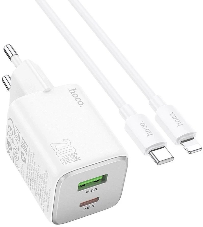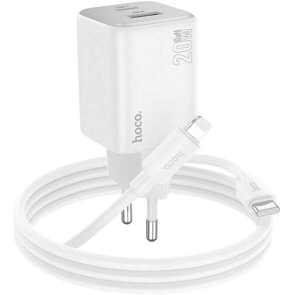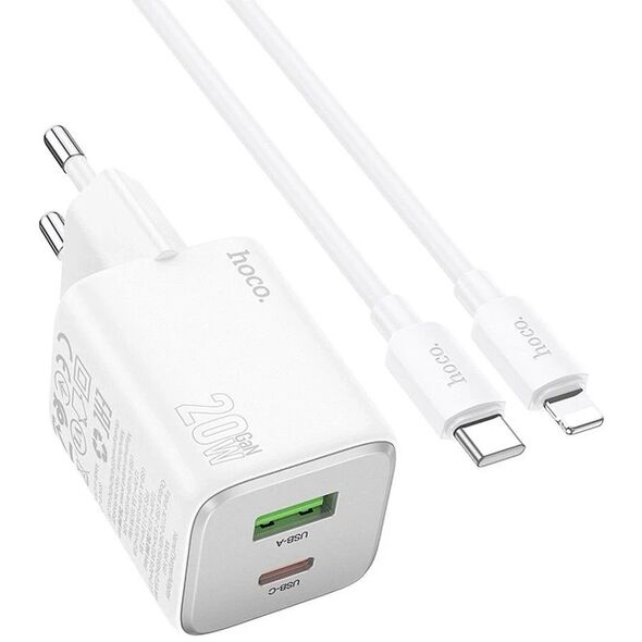 Φορτιστής τοίχου για τηλέφωνο HOCO USB A + USB C QC PD 3A 20W + καλώδιο USB C σε Lightning N41 λευκό