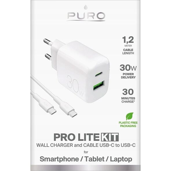 Φορτιστής τοίχου Puro PROLITE 30W USB-A / USB-C + καλώδιο USB-C - USB-C 1.2m - λευκός