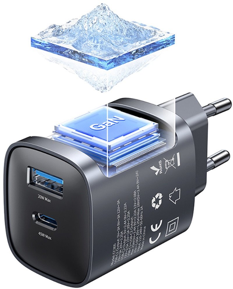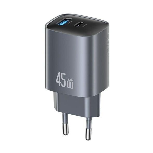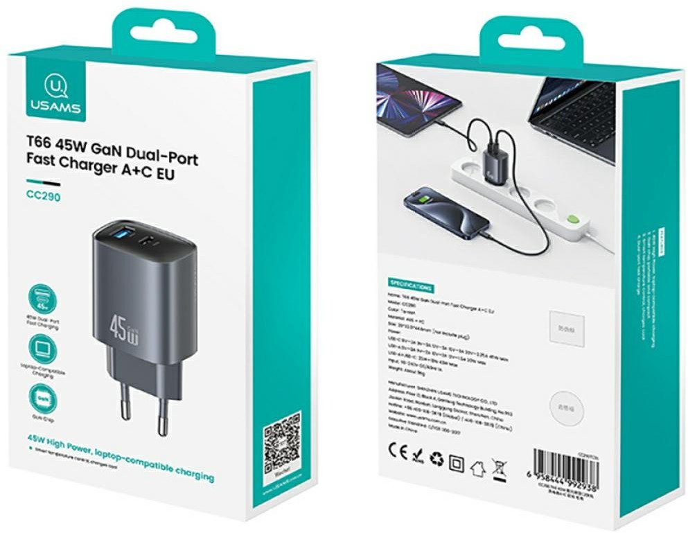 USAMS CC290 T66 to kompaktowa ładowarka sieciowa z technologią GaN o łącznej mocy 45 W, wyposażona w dwa uniwersalne wyjścia: USB-C i USB-A. Dzięki GaN jest mniejsza, chłodniejsza i bardziej wydajna od klasycznych zasilaczy, a jednocześnie zapewnia szybkie ładowanie nowoczesnych urządzeń.