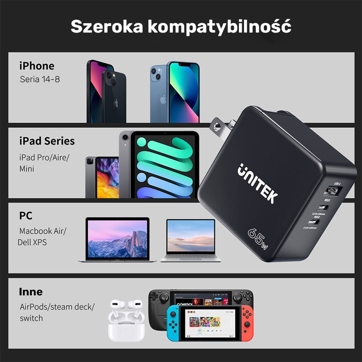 Unitek P1117B jest wyposażona w dwa porty USB-C PD, z których każdy jest w stanie dostarczać imponującą moc 65W oraz jeden port USB-A Quick Charge o mocy 30W. To oznacza, że możesz ładować jednocześnie słuchawki, telefon i tablet, wszystko za pomocą jednej, kompaktowej ładowarki. To prawdziwa innowacja w dziedzinie mobilnego zasilania, zapewniająca wydajność i komfort użytkowania. W pudełku znajdziesz ładowarkę 65 W ze składaną wtyczką US oraz adaptery do gniazdek EU i UK.