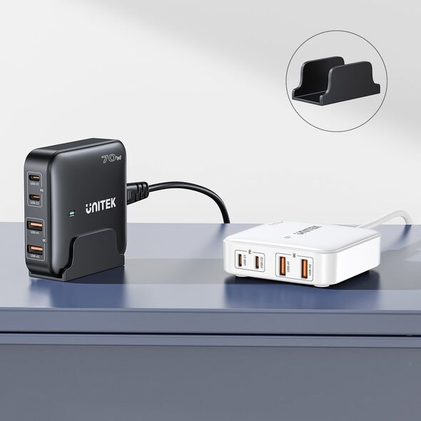 Podłącz do niej jedno, dwa, trzy lub nawet cztery urządzenia jednocześnie i naładuj ich baterie w ekspresowym tempie! Szybka ładowarka USB-C GaN Unitek P1228ABK dysponuje mocą aż 70W, którą dzieli na podłączone urządzenia. Jest nieduża, poręczna i naprawdę solidnie wykonana – idealnie sprawdzi się zarówno w podróży, jak i w domu czy biurze!