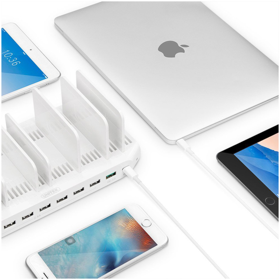 Ο ρυθμιζόμενος φορτιστής USB 10 θυρών πολλαπλασιάζει τις συσκευές που φορτίζονται μέσω της θύρας USB: τηλέφωνα, tablet, power banks, MP4, πλοήγηση, ηλεκτρονικά τσιγάρα, ρολόγια και πολλά άλλα. Τα tablet και τα τηλέφωνα είναι ένα ιδιαίτερο πρόβλημα, επειδή η φόρτιση δύο συσκευών κάνει πολύ χάος στο γραφείο, για να μην αναφέρουμε το κομοδίνο. Η Unitek έχει μια λύση για αυτό με τη μορφή ενός σταθμού φόρτισης που τοποθετεί αμέσως τις φορτισμένες συσκευές κάθετα. Μπορούμε να φορτίσουμε το πολύ 10 συσκευές ταυτόχρονα, με ρεύμα 2,4A σε κάθε θύρα ταχείας φόρτισης QC 3.0 Μια θύρα USB είναι κατασκευασμένη με τεχνολογία QC 3.0, η οποία επιτρέπει 5 φορές ταχύτερη φόρτιση συμβατών φορητών συσκευών. 10 λεπτά φόρτισης είναι αρκετά για 4-5 ώρες ομιλίας. Ανάλογα με τη συσκευή, η τάση επιλέγεται από το εύρος των 5V, 9V, 12V, 19V Έξυπνη και γρήγορη φόρτιση Ο σταθμός φόρτισης Unitek Y-2190 είναι συμβατός με το πρωτόκολλο BC 1.2, το οποίο ελέγχει έξυπνα τη φόρτιση, εξασφαλίζοντας την κατάλληλη τάση. ρυθμίζεται και η τροφοδοσία αποσυνδέεται όταν η συσκευή είναι ήδη φορτισμένη, μέγιστη γρήγορη φόρτιση και πολλές άλλες πτυχές που παρατείνουν τη διάρκεια ζωής των μπαταριών και διατηρούν την αρχική τους χωρητικότητα. Είναι επίσης εξοπλισμένο με μια σειρά από προστασίες - από υπερφόρτιση, υπερθέρμανση, υπερβολική τάση και βραχυκύκλωμα Ο σταθμός φόρτισης Unitek Y-2190 είναι τέλειος για το γραφείο. Στο σπίτι, θα λειτουργεί ως κέντρο φόρτισης στο σπίτι, όπου αφήνουμε τα τηλέφωνά μας αφού επιστρέψουμε από τη δουλειά ή το σχολείο, ώστε να μπορούμε να διασκεδάζουμε μόνο στο σπίτι (Πού είναι ο φορτιστής μου!). Ο σταθμός φόρτισης θα λειτουργεί όπου πολλά άτομα χρειάζονται να φορτίσουν πολλές συσκευές, σε αίθουσες συνεδριάσεων, σχολεία, νοσοκομεία, εστιατόρια κ.λπ. Κύρια χαρακτηριστικά: