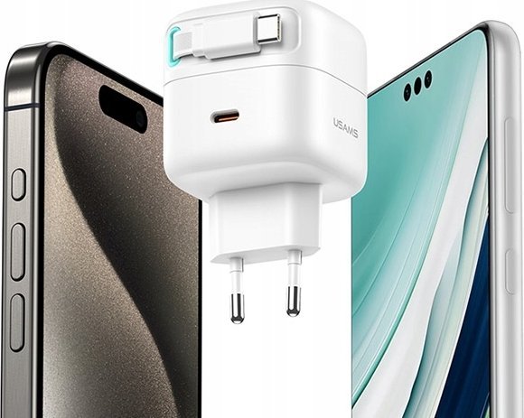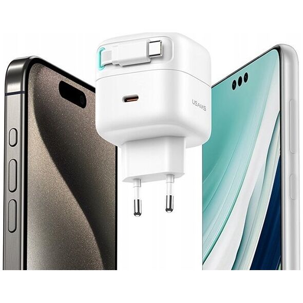 USAMS Ładowarka sieciowa 1xUSB-C ze zwijanym kablem USB-C PD+QC 35W Gan Fast Charging
