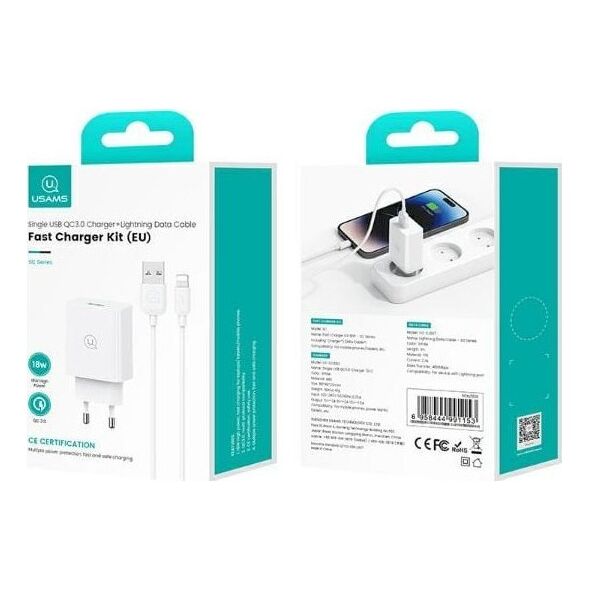 Φορτιστής Usams USAMS Φορτιστής τοίχου 18W + καλώδιο Lightning/ USB-A Γρήγορη Φόρτιση λευκό/σειρά white SC SCXLTZ03