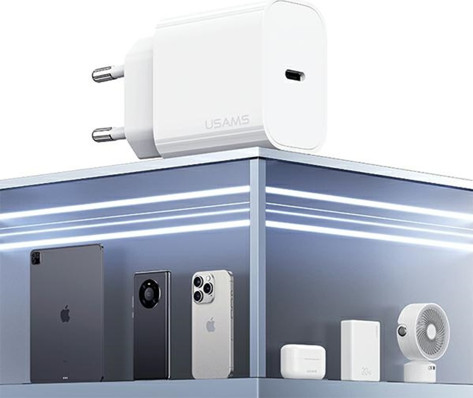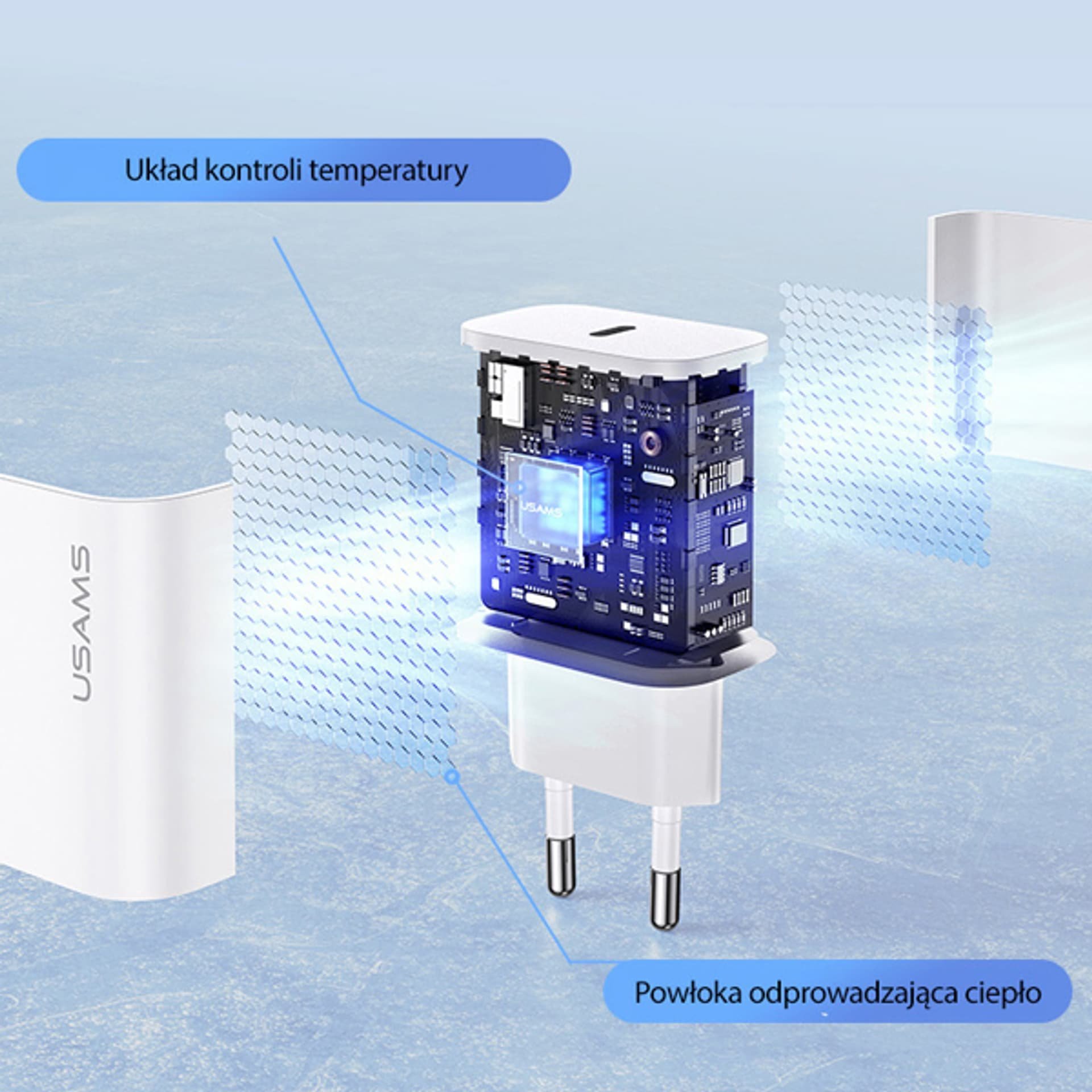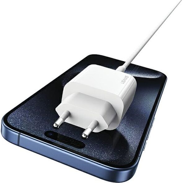USAMS brand fast network charger with USB-C output, supporting Power Delivery technology. It will intelligently and safely charge your device while protecting the battery inside it. With its temperature control circuit and special heat dissipation coating, it protects against overheating effects. The charger supports faster charging for Apple devices (iPhone 8/9/10/11/12/13/14/15)
