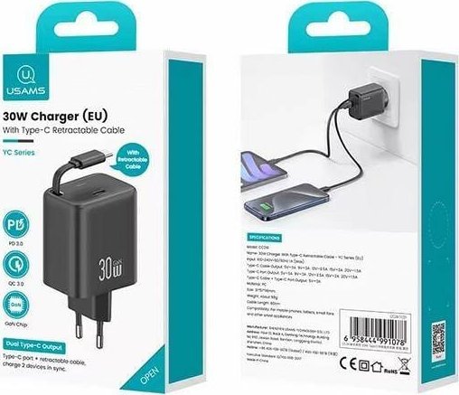 Φορτιστής USAMS USAMS Φορτιστής τοίχου 1xUSB-C με αναδιπλούμενο καλώδιο USB-C Αναδιπλούμενη PD+QC 30W Gan Γρήγορη Φόρτιση λευκό/white YC Series CC241TC02 (US-CC241)