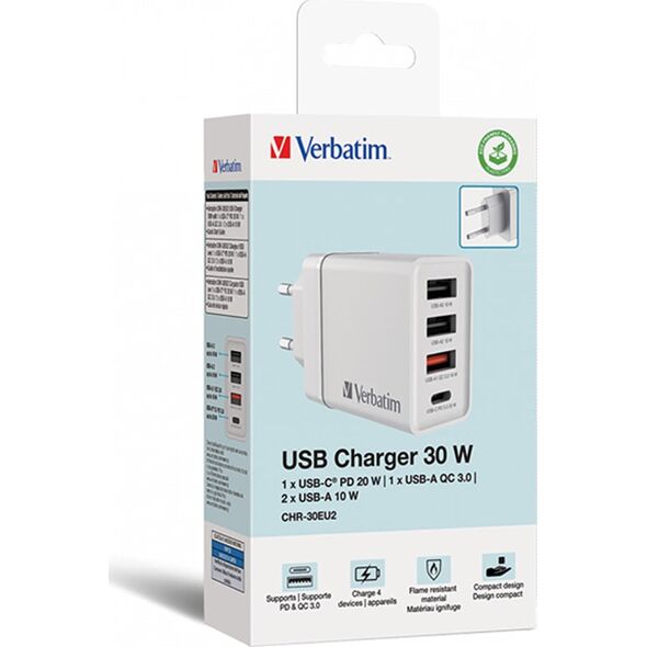 Φορτιστής Verbatim Φορτιστής τοίχου Verbatim 1xUSB-C PD 20W 1xUSB-A QC 3.0 2xUSB-A 10W UE λευκός