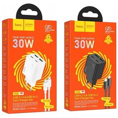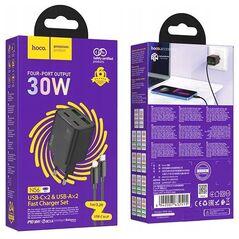 Φορτιστής τοίχου για τηλέφωνο HOCO 2 x USB C + 2 x USB A QC3.0 PD 3A 30W + καλώδιο USB C σε USB C N56 μαύρο